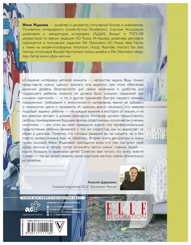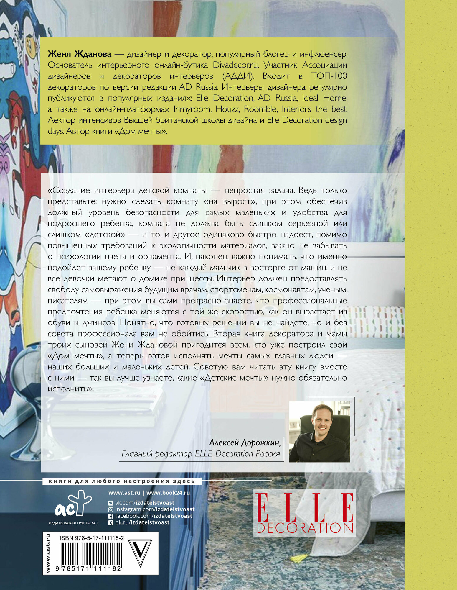 «Создание интерьера детской комнаты – непростая задача. Ведь только представьте: нужно создать комнату «на вырост», при этом обеспечив должный уровень безопасности для самых маленьких и удобства для подросшего ребенка, комната не должна быть слишком серьезной или слишком «детской» – и то, и другое одинаково быстро надоест, помимо повышенных требований к экологичности материалов, важно не забывать о психологии цвета и орнамента. И, наконец, важно понимать, что именно подойдет вашему ребенку – не каждый мальчик в восторге от машин, и не все девочки метают о домике принцессы. Интерьер должен создавать свободу самовыражения для будущих врачей, спортсменов, космонавтов, ученых, писателей – при этом вы сами прекрасно знаете, что профессиональные предпочтения ребенка меняются с той же скоростью, как он вырастает из обуви и джинсов. Понятно, что готовых решений вы не найдете, но и без совета профессионала вам не обойтись. Вторая книга декоратора и мамы троих сыновей Жени Ждановой пригодится всем, кто уже построил свой «Дом мечты», а теперь готов исполнять мечты самых главных людей – наших больших и маленьких детей. Советую вам читать эту книгу вместе с ними – так вы лучше узнаете, какие «Детские мечты» нужно обязательно исполнить».