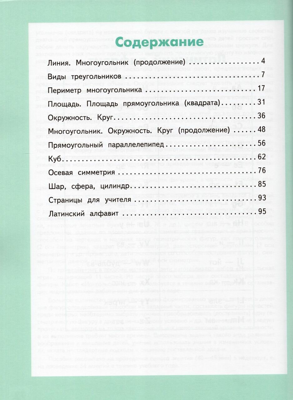 Содержание пособия представляет собой дополнительный материал по геометрическому разделу начального курса математики. В него включены группы заданий, направленные на развитие у детей пространственного воображения и мышления, овладение практическими и графическими способами моделирования, формирование умения применять геометрические знания о форме, размере и взаимном расположении предметов для решения задач прикладного содержания.