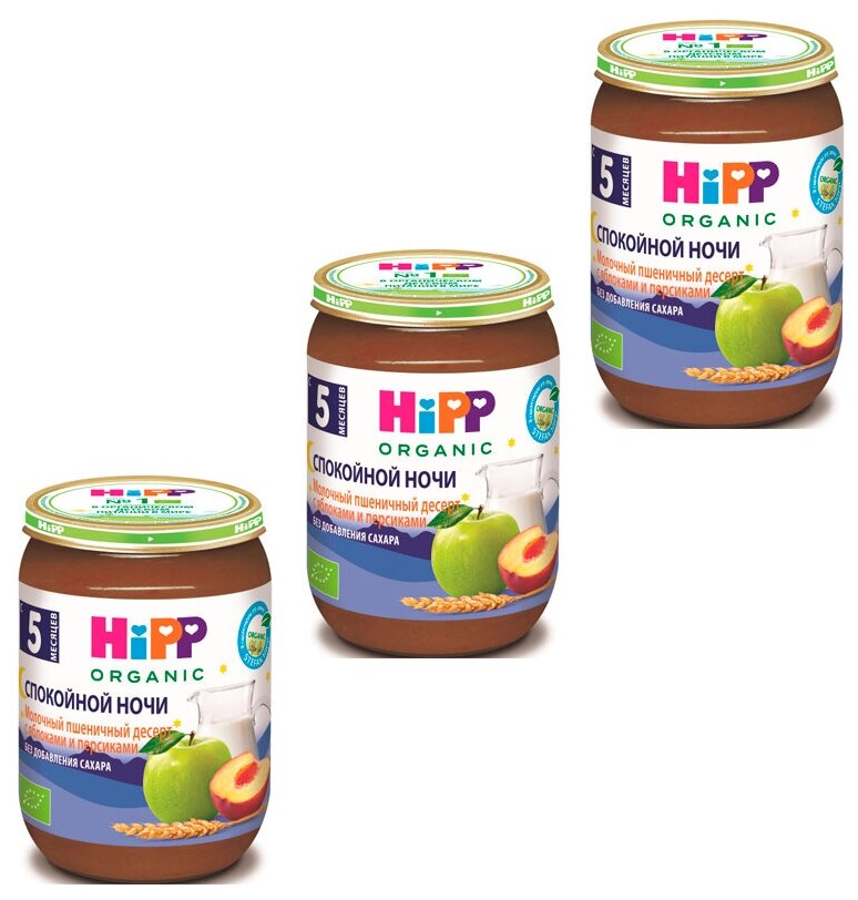 Десерт молочный Hipp манный Яблоко Персик с 5 мес. 190 гр. Приготовлен на основе молочной смеси, адаптированной к потребностям ребенка. Создан для кормления ребенка перед сном. Манная каша единственная крупа, которая переваривается в нижнем отделе кишечника и только там всасывается в его стенки. Она наполняет организм силой, является лучшим средством для лечения всех болезней желудка. Содержащиеся в яблочном пюре пектин и пищевые волокна оказывают благотворное воздействие на функцию кишечника. Отличное сочетание железа с витамином С способствует профилактике железодефицитной анемии у ребенка. Абрикосы рекомендуются при малокровии и сниженном аппетите. Для нормальной работы сердечно-сосудистой системы необходим калий, который содержится в пюре из абрикосов в достаточном количестве. Каротины абрикоса обеспечат профилактику авитаминозов, улучшат состояние кожи и слизистых оболочек, а витамин С повысит защитные силы организма, препятствуя частым простудным заболеваниям и укрепляя стенки сосудов. Абрикосы улучшают работу мозга и сердца, укрепляют кости и зубы, помогают бороться со стрессом, обладаеют мягким слабительным свойством. Абрикос - прекрасный источник клетчатки и пектина. С кальцием для правильного формирования костей. Богат витамином В1. Идеально сбалансированный для малыша продукт. Без консервантов, красителей, ароматизаторов и ГМО. Органический продукт. Способ употребления: начинайте с 0,5 чайной ложки 1 раз в день, постепенно увеличивая порцию до необходимого количества. Продукт готов к употреблению. При желании подогрейте на водяной бане или в микроволновой печи требуемое количество, перемешайте и проверьте температуру. Остаток пюре, который не подогревался, хранить в холодильнике в закрытой баночке не более 24 часов. Чтобы предотвратить повреждение баночки, пожалуйста, используйте только пластиковую ложку. Пожалуйста, перед употреблением убедитесь, что баночка не повреждена. Не используйте данный продукт, если крышка прогибается при надавливании. Вогнутость центра крышки до вскрытия баночки гарантия качества. При вскрытии баночки должен быть слышен характерный хлопок.