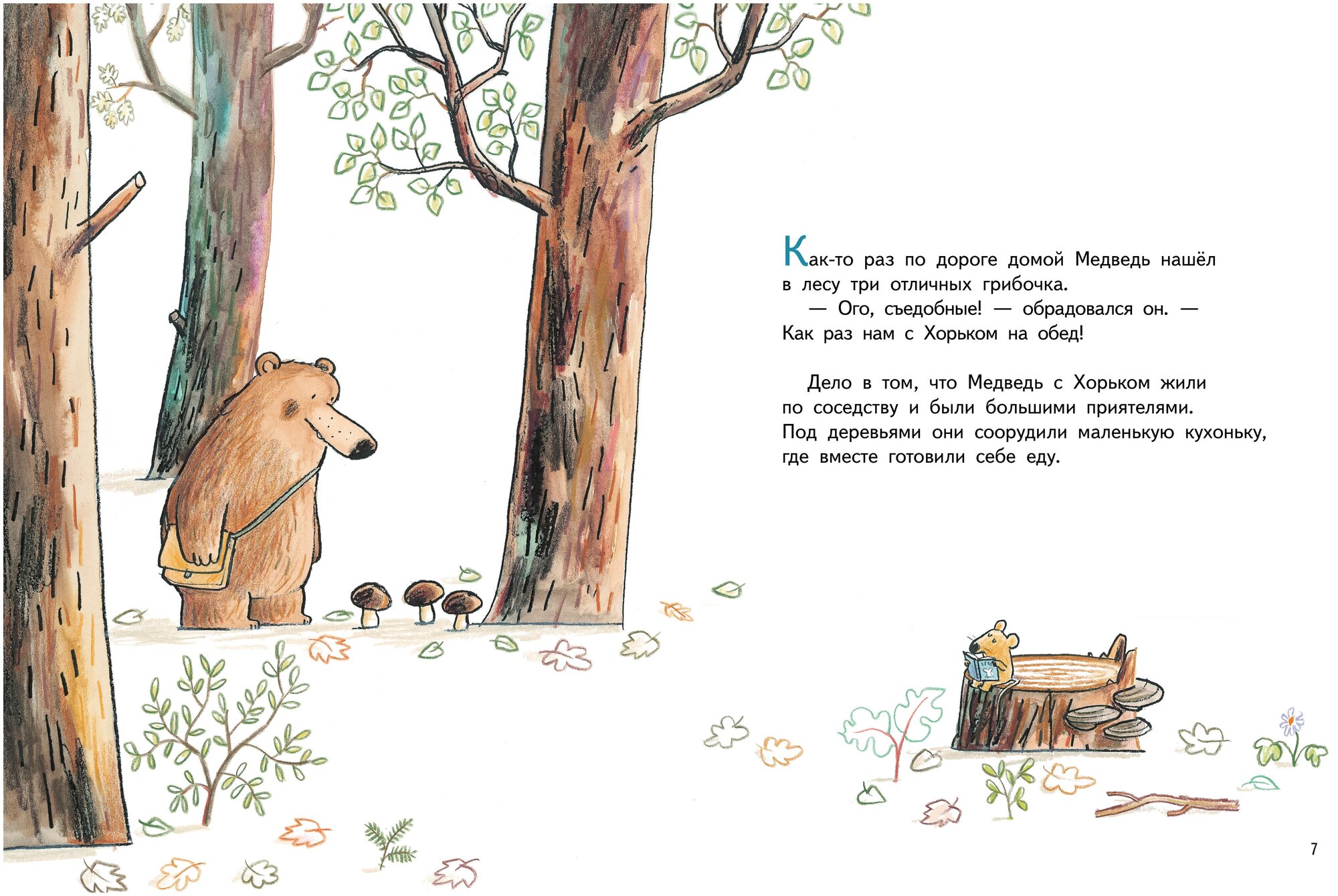 Однажды Медведь нашел в лесу три аппетитных грибочка и принес их домой. Дома его сосед и приятель Хорёк эти грибочки как следует помыл и пожарил в масле на большой сковороде, не забыв приправить солью, перцем и свежей петрушкой. Медведь же тем временем накрыл на стол. И вот наконец друзья уселись обедать. Но тут встал вопрос: как поделить грибы по-честному? Ведь три на два не делится. Каждый настаивает на том, что лишний грибочек должен достаться именно ему и приводит убедительные объяснения, которые тут же оспариваются соперником. Друзья чуть было не поссорились, но, к счастью, положение вовремя спас откуда ни возьмись появившийся рыжий Лис. Книга для детей 3-5 лет, которым чуть ли не каждый день приходится делить что-либо "по-честному" с братьями, сёстрами, друзьями и совершенно незнакомыми детьми на детской площадке. Серия "Для самых маленьких" рассчитана на детей в возрасте от 3 до 5 лет. В ней собраны лучшие книжки-картинки современных иностранных авторов и художников. Каждую такую книжку отличает интересный сюжет, понятный детям самого младшего возраста, и яркие, динамичные иллюстрации на каждом развороте. Именно такие книги выручают родителей, когда те задаются неизбежным вопросом "Что бы еще почитать?", когда вся малышовая детская классика перечитана и засмотрена до дыр. Кроме того, книги серии "Для самых маленьких" прекрасно подойдут для первого самостоятельного чтения детям старшего дошкольного возраста.