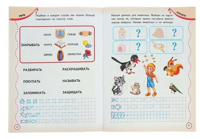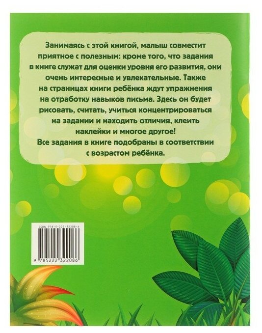 Занимаясь с этой книгой, малыш совместит приятное с полезным: кроме того, что задания в книге служат для оценки уровня его развития, они очень интересные и увлекательные. Также на страницах книги ребёнка ждут упражнения на отработку навыков письма. Здесь он будет рисовать, считать, учиться концентрироваться на задании и находить отличия, клеить наклейки и многое другое!