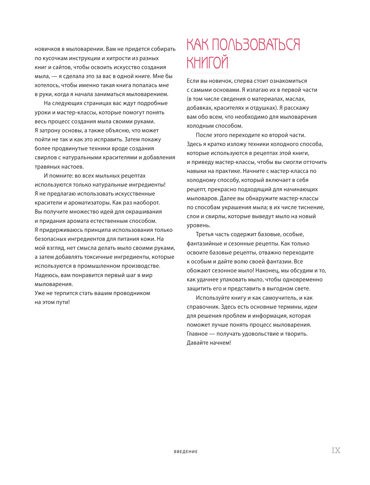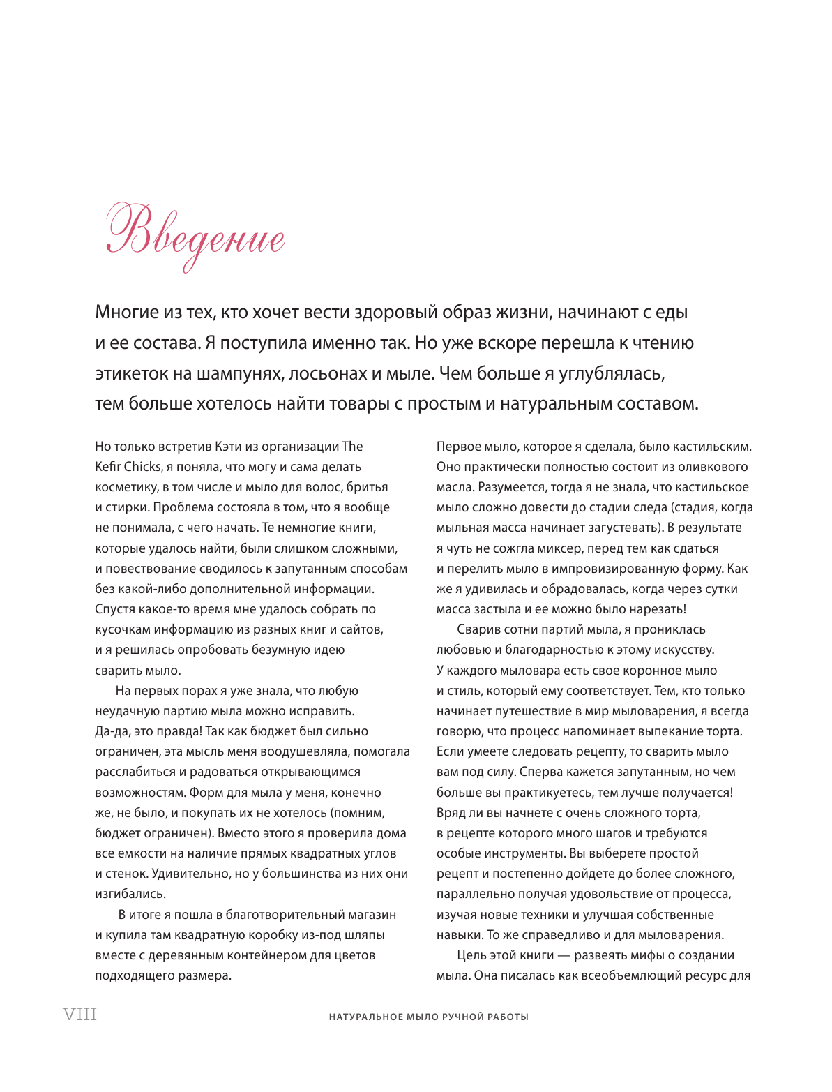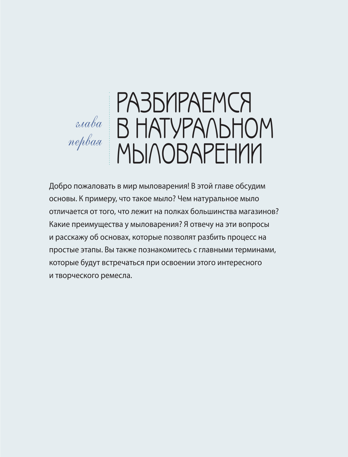 Очень мотивирующая книга! Купила ее на выставке, не будучи уверенной, что хочу этим заниматься. Но прочитав первые страниц 30, полностью изменила мнение и буквально загорелась идеей делать мыло! Автор настолько просто, подробно все обьясняет и рассказывает, что кажется, ошибиться невозможно. А если ошибетесь, вам тут же расскажут, как это исправить. Книга просто вкусная, если можно так выразиться. В конце концов о нашем здоровье никто не позаботиться, кроме нас самих. Так что уже заказала ингредиенты и буду учиться. Спасибо за вдохновение!