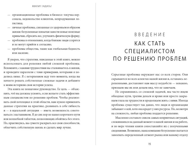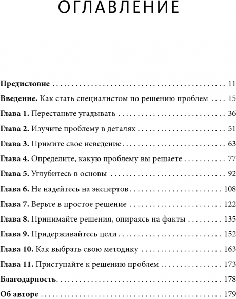 Книга, на мой взгляд, абсолютно бесполезная, ни методик, ни стратегий по решению проблем в ней не изложено. Общие фразы. Приведенные примеры большей частью однотипные и не содержат детального разбора поиска решения проблемы. Автор пишет, что есть множество методик, но не приводит ни одной, ссылок на источники в книге вы тоже не найдете.