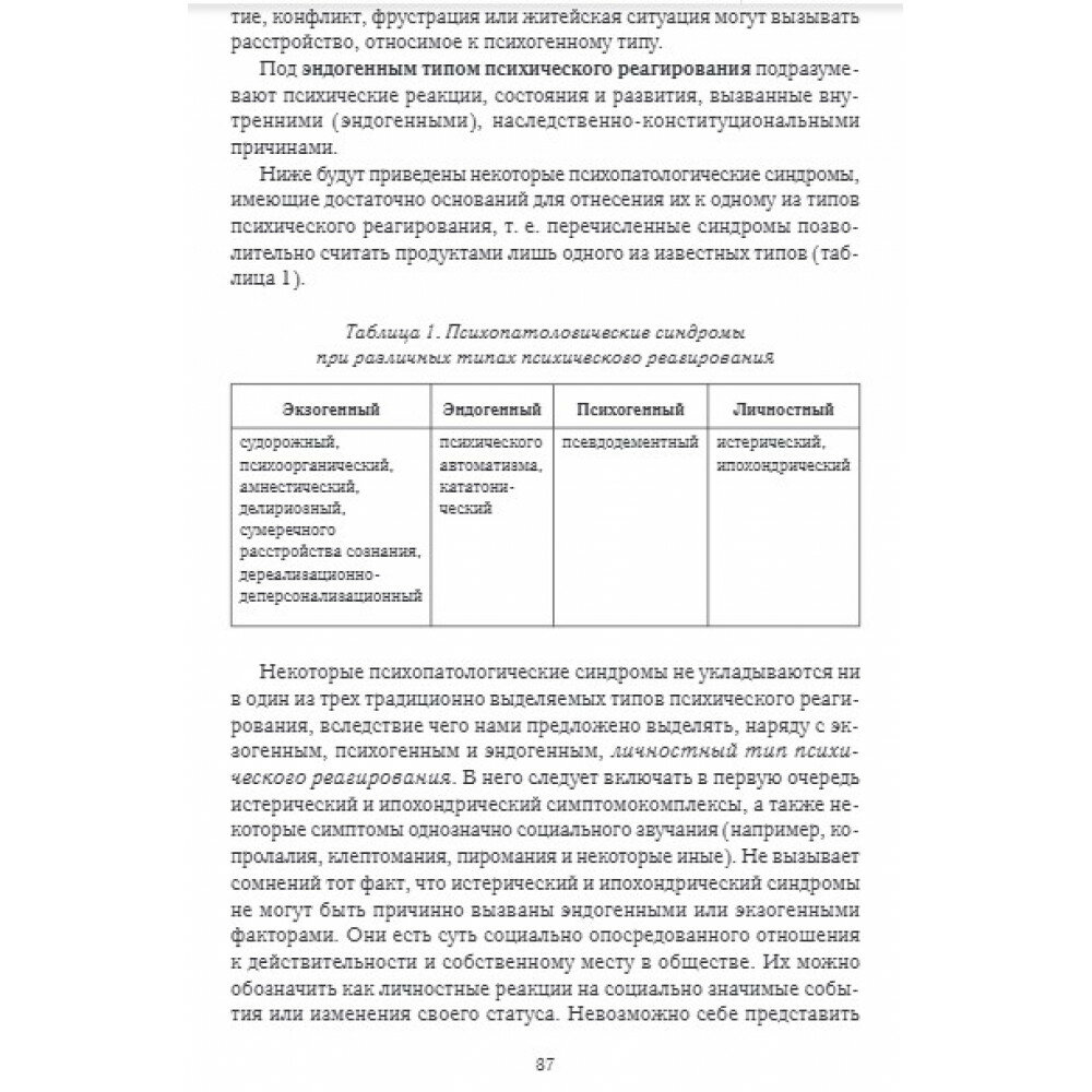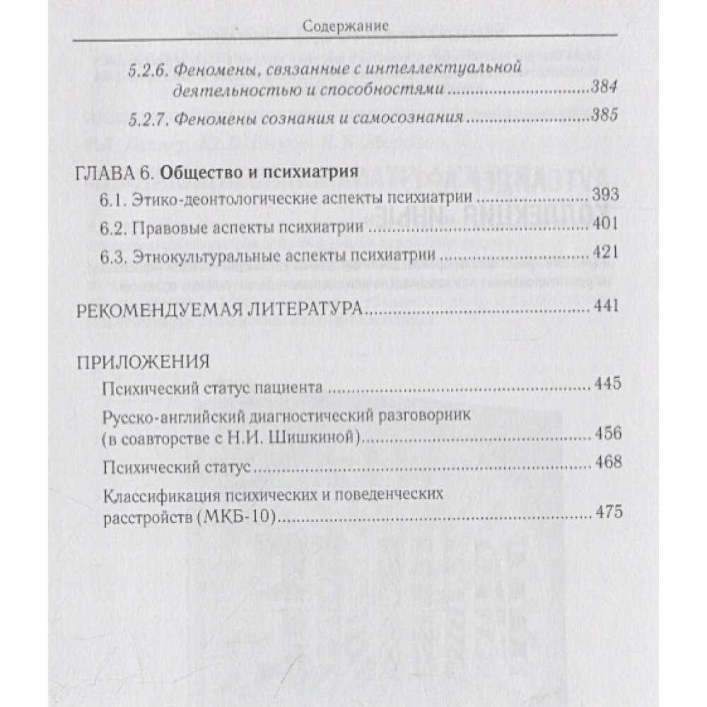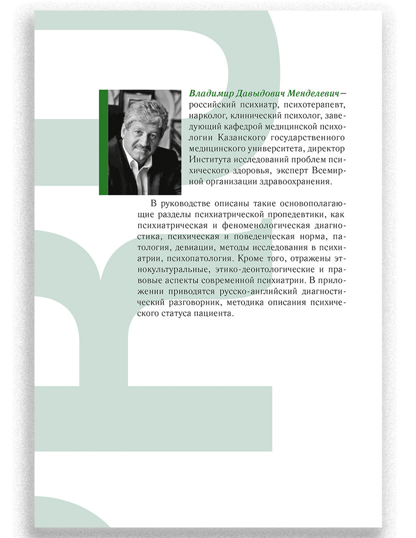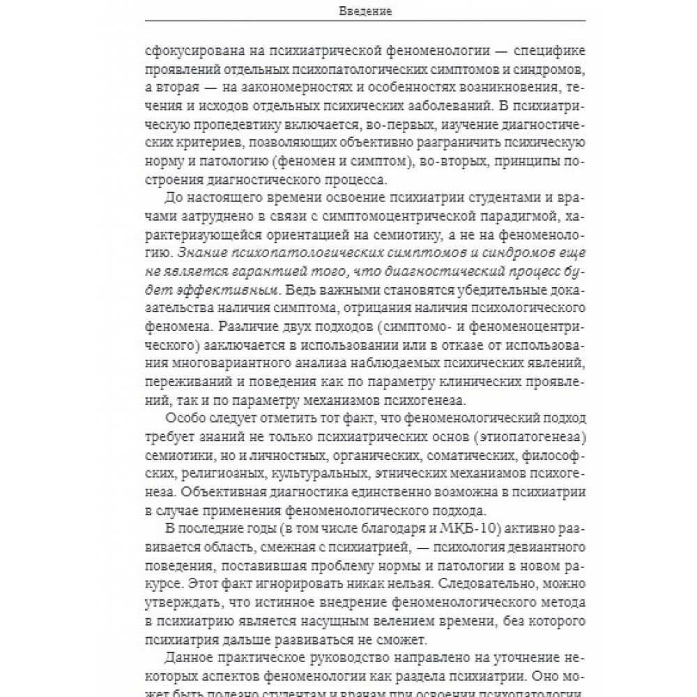 В руководстве описаны такие основополагающие разделы психиатрической пропедевтики, как психиатрическая и феноменологическая диагностика, психическая и поведенческая норма, патология, девиации, методы исследования в психиатрии, психопатология. Кроме того, отражены этнокультуральные, этико-деонтологические и правовые аспекты современной психиатрии. В приложениях приводятся задачи для программированного контроля знаний по общей психопатологии, правовым вопросам психиатрии, русско-английский диагностический разговорник, методика описания психического статуса пациента. Руководство рассчитано на психиатров, клинических (медицинских) психологов, психотерапевтов, социальных работников, юристов, а также может использоваться в учебном процессе студентами медицинских и психологических вузов, интернами, ординаторами и аспирантами, стажирующимися в области психиатрии.
