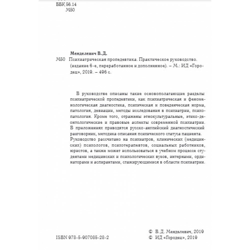Психиатрическая пропедевтика. Практическое руководство (В. Д. Менделевич); Издательский дом «Городец», 2019