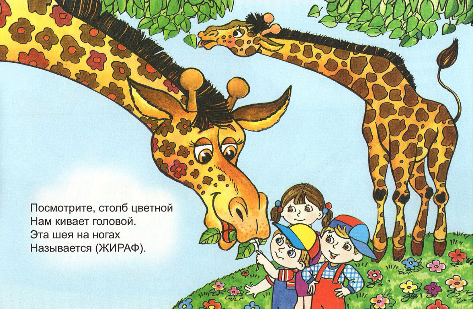 Отличная книжка небольшого формата, очень красочная с понятными картинками. Листы из плотной бумаги. На каждой странице по одному стихотворению-загадке. Ребёнок с удовольствием заканчивает стихотворение. Текст понятен. Стихотворения небольшие, но емкие по содержанию. Ребёнок доволен. Книжку удобно брать с собой на прогулку. Иллюстрации очень яркие - рисунок по всей станице. Книжка даёт ребёнку первые представления о мире животных.
