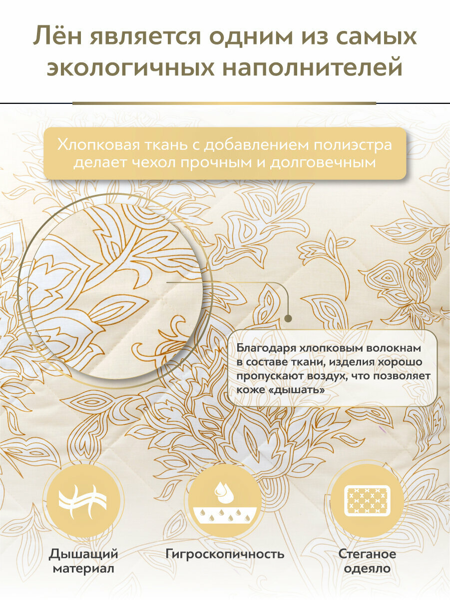 Одеяло ''Благородный лен'' создаст комфортные условия для сна благодаря уникальным природным свойствам натурального льна, входящего в состав наполнителя. Лен обеспечивает идеальный температурный режим как в жару, так и в холодное время года. Высокая гигиеничность повышает его антибактериальные и гипоаллергенные свойства. Одеяло из льна очень практично - за ним несложно ухаживать в домашних условиях. Прочный чехол из поликоттона дышит и отлично впитывает влагу, имеет высокие экологические показатели.