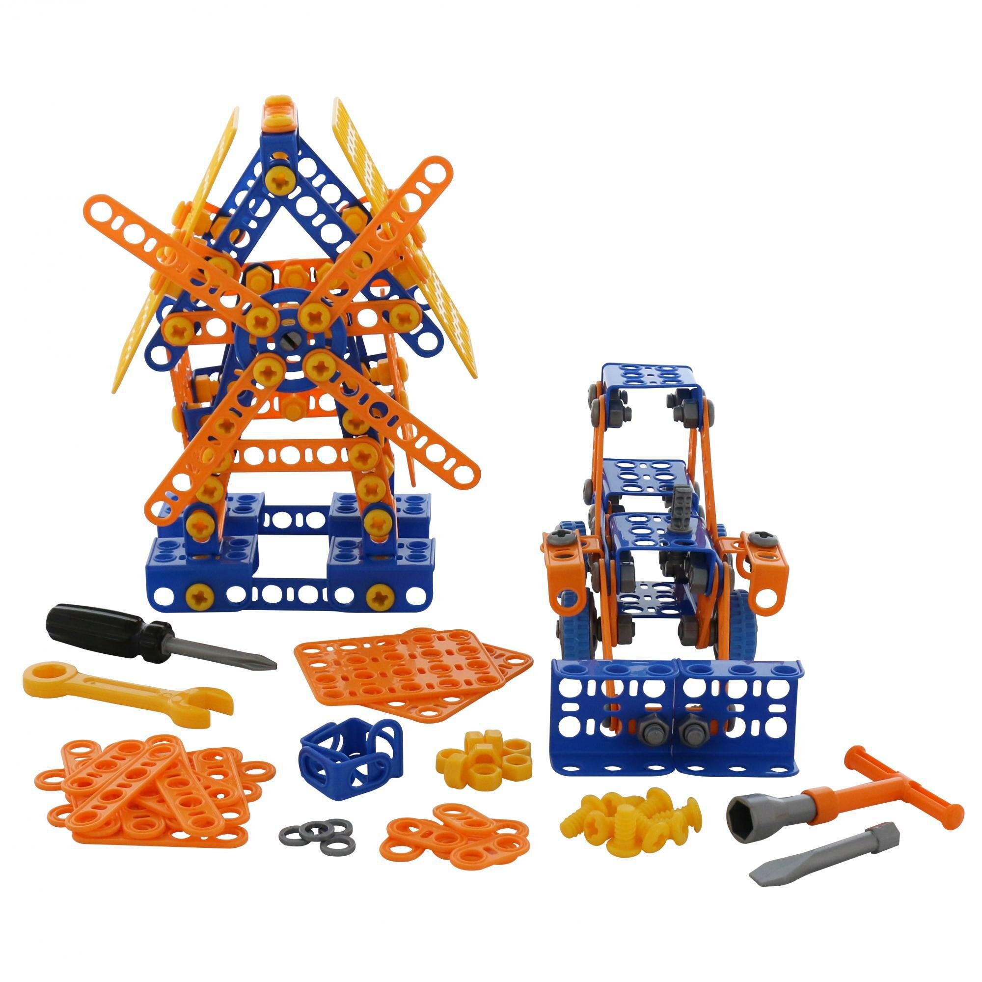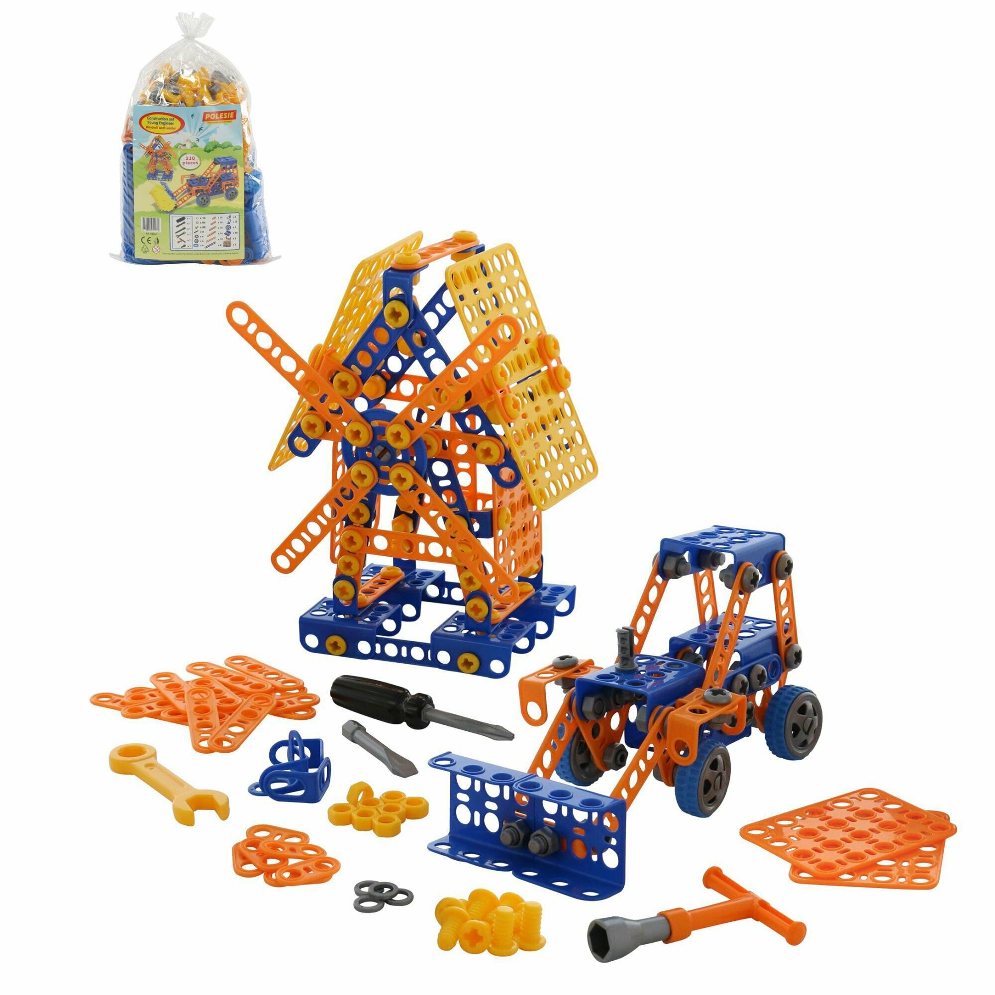 В комплекте прямые плоские соединительные детали различной длины, объемные детали для основы трактора, колеса, детали для имитации кабины и ковша, детали для сборки мельницы, а также множество болтиков различных цветов для соединения всех деталек между собой и необходимые дополнительные инструменты (отвертка с различной резьбой и гаечные ключи), которые затем можно использовать в других детских играх, связанных с домашним бытом, ремонтом или строительством.