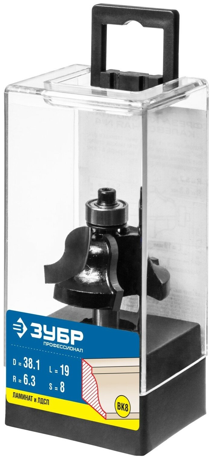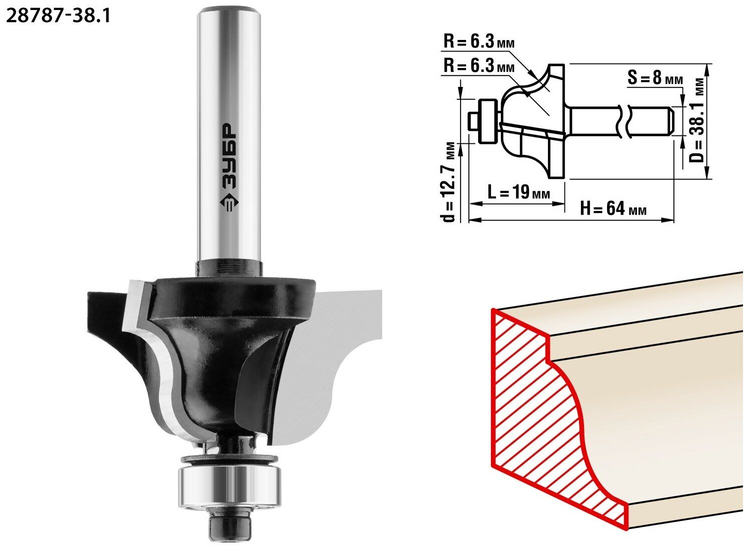 Фреза ЗУБР "ПРОФЕССИОНАЛ" кромочная калевочная №4, диаметр-38.1 мм, рабочая длина-19 мм, радиус-6,3 мм, хвостовик-8 мм, диаметр подшипника-12,7 мм