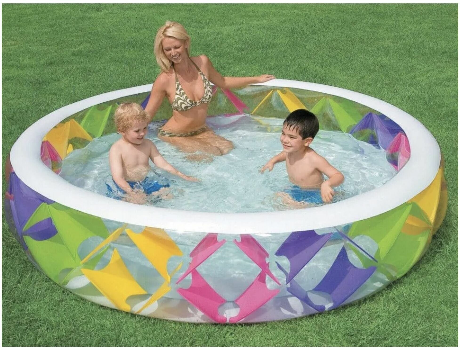 Бассейн прозрачный с надувным дном INTEX. Большой круглый бассейн с надувным полом и широкими прозрачными стенками. Бассейн достаточно большой, в нем с комфортом поместится несколько человек, включая взрослых. Широкие прозрачные стенки бассейна помогут наблюдать за ребенком, а взрослый может удобно облокотиться на них. Надувной пол обеспечивает дополнительный комфорт. Насос в комплект входит.