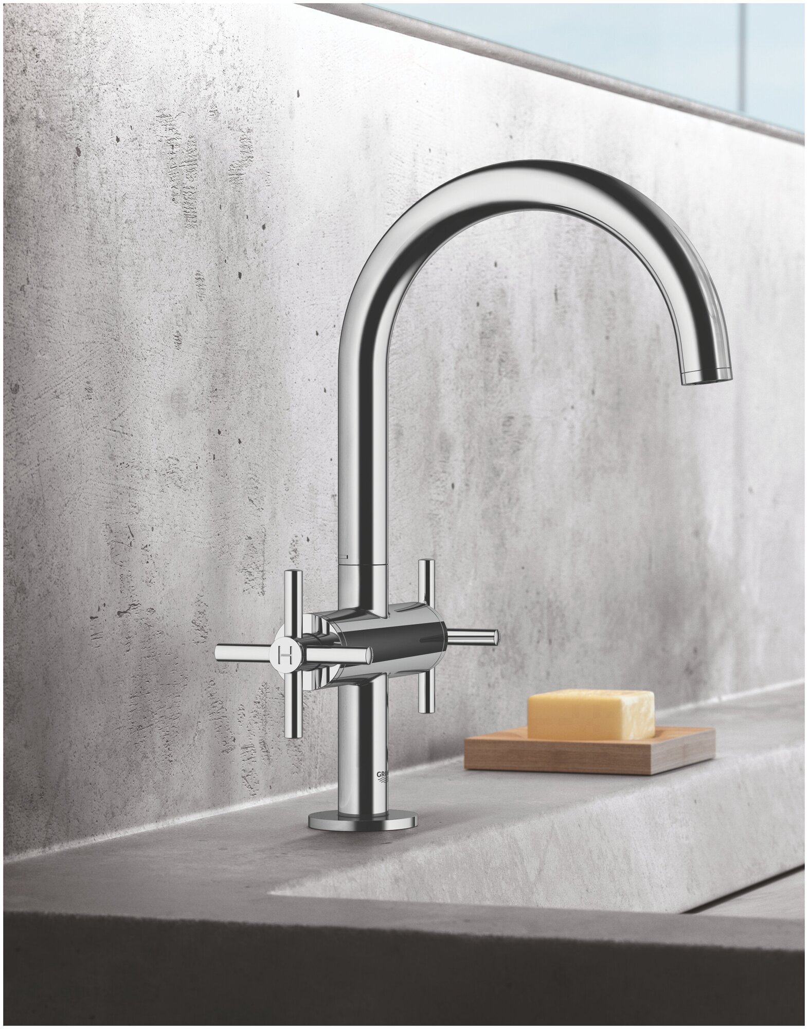Утонченный, элегантный с аккуратно изогнутым изливом двухвентильный смеситель для раковины GROHE Atrio с прекрасно осязаемыми крестообразными рукоятками - идеальное сочетание линий, пропорций и роскошного покрытия. Будучи результатом тщательного дизайнерского процесса, этот смеситель является премиальным продуктом, который обеспечит надежное, гладкое управление и аккуратный вид на годы использования. Управление с помощью двух крестообразных рукояток предлагают плавный, точный контроль, будучи надежным и долговременным.