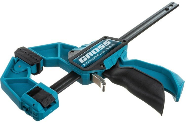 **Струбцина быстрозажимная Gross ** предназначена для соединения деталей между собой. Курковый фиксатор обеспечивает плотность сжатия. Применяется при проведении монтажных или столярных работ. Губки оснащены накладками, исключающими деформацию поверхности. Рукоятка выполнена из пластика.