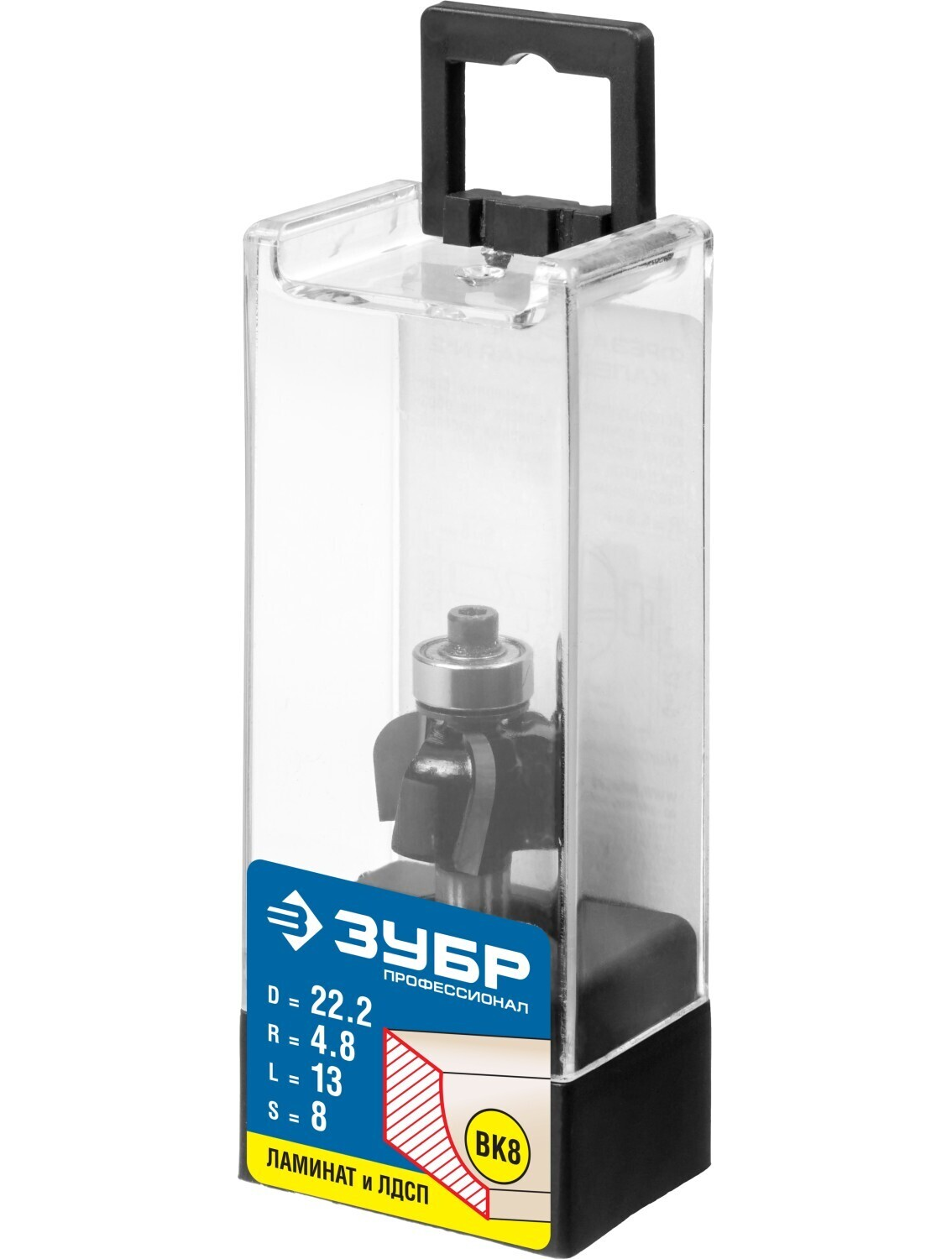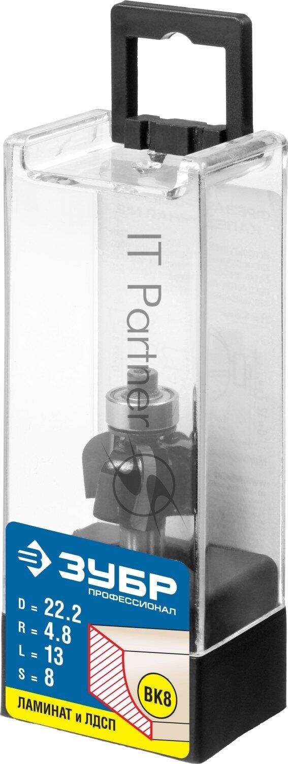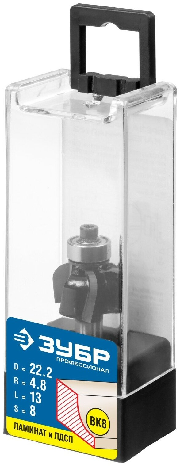 Фреза ЗУБР "ПРОФЕССИОНАЛ" кромочная калевочная №2, диаметр-22,2 мм, рабочая длина-13 мм, радиус-4,8 мм, хвостовик-8 мм, диаметр подшипника-12,7 мм