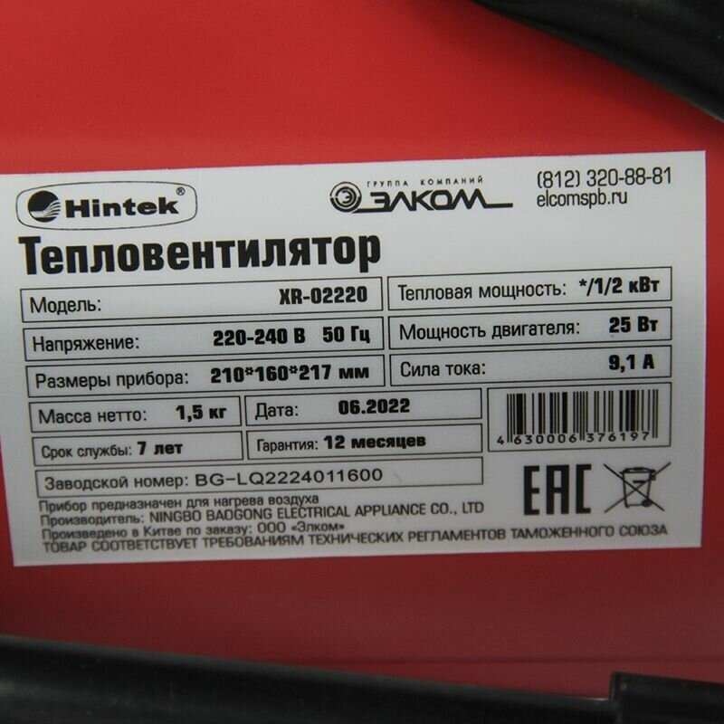 Электротепловентилятор Hintek Xr-02220