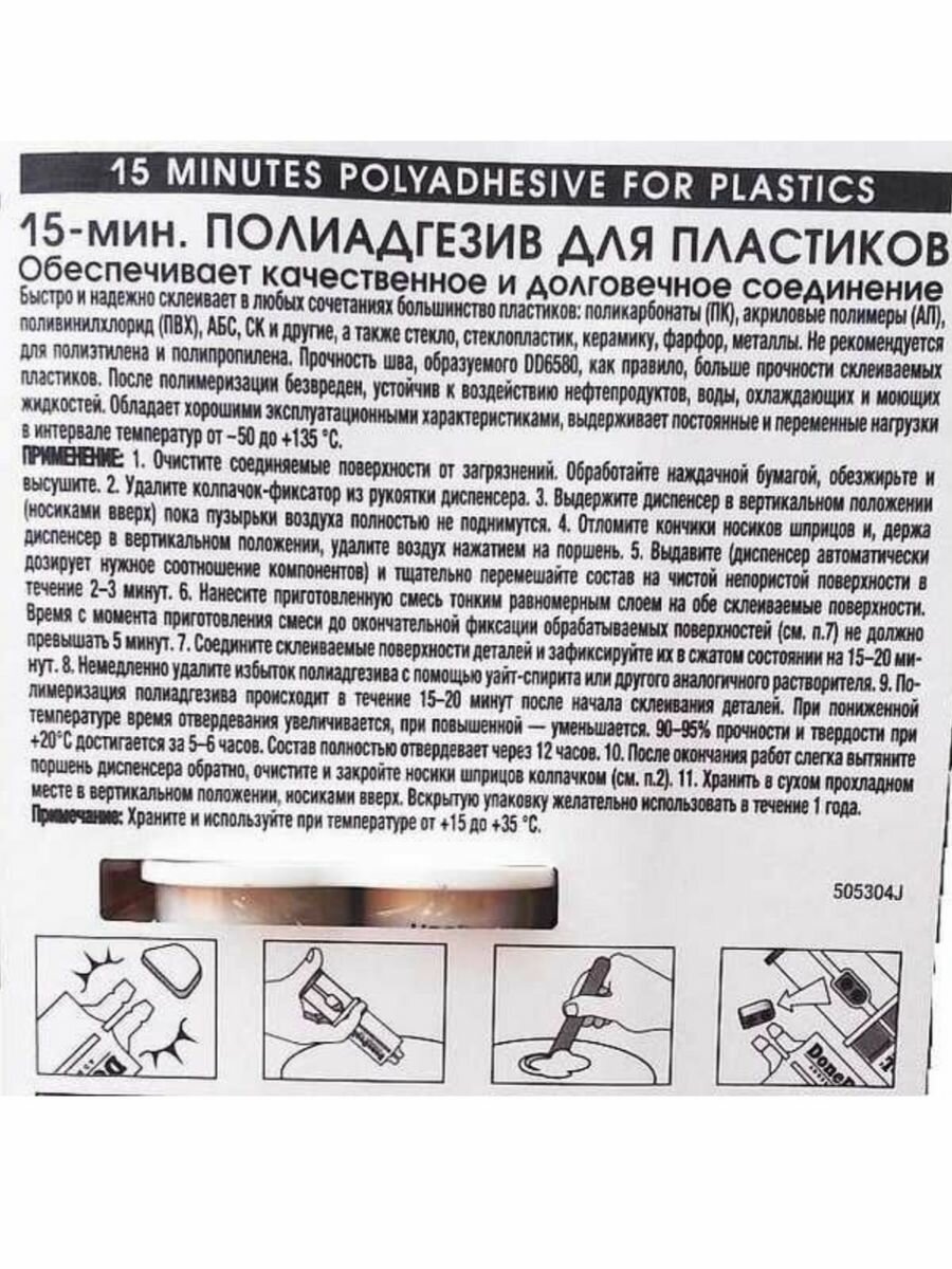 15-минутный полиадгезив обеспечивает качественное и надежное соединение.Быстро и надежно склеивает в любых сочетаниях большинство пластиков: поликарбонаты (ПК), акриловые полимеры (АП), поливинилхлорид (ПВХ), АБС, СК и другие, а также стекло, стеклопластик, керамику, фарфор, металлы.Не рекомендуется для полиэтилена и полипропилена.Прочность шва, образуемого , как правило, превосходит прочность склеиваемых пластиков.После полимеризации безвреден, устойчив к воздействию нефтепродуктов, воды, охлаждающих и моющих жидкостей.Обладает хорошими эксплуатационными характеристиками, не дает усадки, выдерживает постоянные и переменные нагрузки в интервале температур от -55 до +150 °С.Прочность соединения: 226 кг/см.применение: Очистите соединяемые поверхности от загрязнений. Обработайте наждачной бумагой, обезжирьте и высушите. Удалите колпачок-фиксатор из рукоятки диспенсера. Выдержите диспенсер в вертикальном положении, носиками вверх, пока пузырьки воздуха полностью не поднимутся. Отломите кончики носиков шприцев и, держа диспенсер в вертикальном положении, удалите воздух нажатием на поршень. Выдавите (диспенсер автоматически дозирует нужное соотношение компонентов) и тщательно перемешайте состав на чистой непористой поверхности в течение 2—3 минут. Нанесите приготовленную смесь тонким равномерным слоем на обе склеиваемые поверхности. Время с момента приготовления смеси до окончательной фиксации обрабатываемых поверхностей (см. п. 7) не должно превышать 5 минут. Соедините склеиваемые поверхности деталей и зафиксируйте их в сжатом состоянии на 15—20 минут. Немедленно удалите избыток состава с помощью уайт-спирита или другого аналогичного растворителя. Полимеризация полиадгезива происходит в течение 15—20 минут после начала склеивания деталей. При пониженной температуре время отвердевания увеличивается, при повышенной — уменьшается. 90—95 % прочности и твердости при +20 °С достигается за 5—6 часов. Состав полностью отвердевает через 12 часов. После окончания работ слегка вытяните поршень диспенсера обратно, очистите и закройте носики шприцев колпачком (см. п. 2). Храните в сухом прохладном месте в вертикальном положении, носиками вверх. Вскрытую упаковку желательно использовать в течение 1 года.примечание:Храните и используйте препарат при температуре от +15 до +35 °С.состав: Сложный эфир метакриловой кислоты, акриловые олигомеры, метакриловая кислота, ионол, гидропероксид кумола, тозилхлорид, функциональные добавки, составляющиеноу-хау компании.внимание: Огнеопасно. Применяйте в условиях хорошей вентиляции. Не допускайте попадания на кожу и в глаза! При попадании на кожу промойте водой с мылом. При попадании в глаза обильно промойте водой и обратитесь к врачу. При проглатывании не вызывайте рвоту, немедленно обратитесь к врачу. После использования или окончания срока годности утилизируется как бытовые отходы. Хранить в недоступном для детей месте!