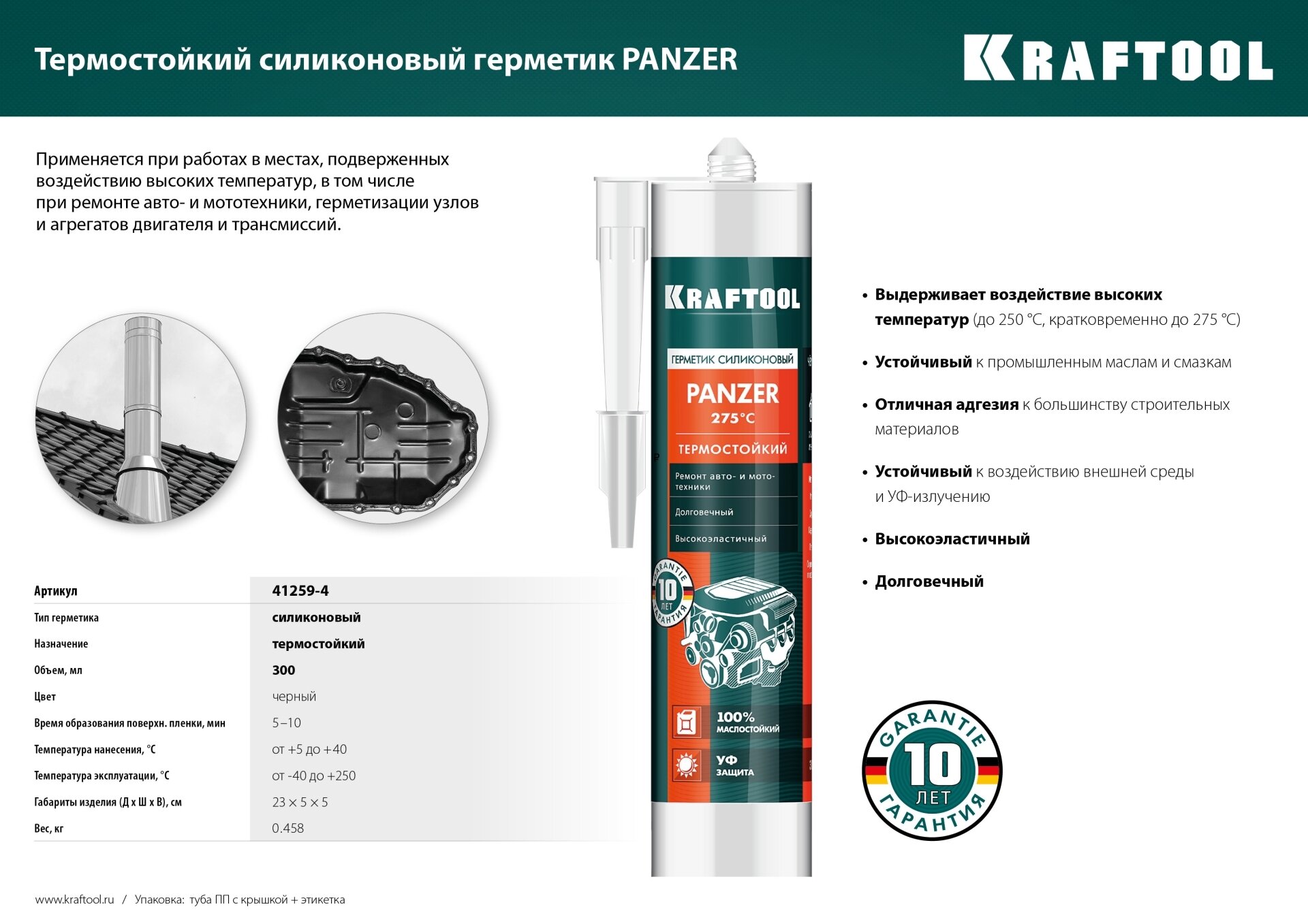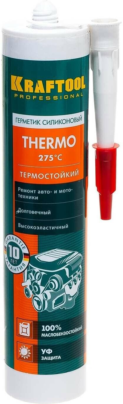 Силиконовый герметик, термостойкий, KRAFTOOL серия "Expert", от -65 до +315 °С, 300 мл ( ) Профессиональный термостойкий силиконовый герметик широкого применения, затвердевающий под воздействием влаги, содержащейся в воздухе. Применяется для внутренних и наружных работ: герметизации соединений, подвергающихся воздействию высоких температур, в автомобильных и промышленных двигателях, в насосах, коробках передач, компрессорах и других видах оборудования, в вентиляционных системах, в печах и каминах. Идеален при использовании в подвижных швах в широком диапазоне температур. Внимание! Непригоден для окрашивания, нельзя использовать для аквариумов, зеркал и в местах возможного контакта с пищей и питьевой водой.
