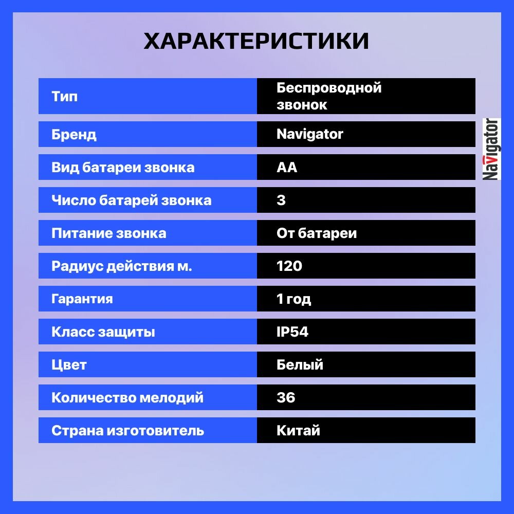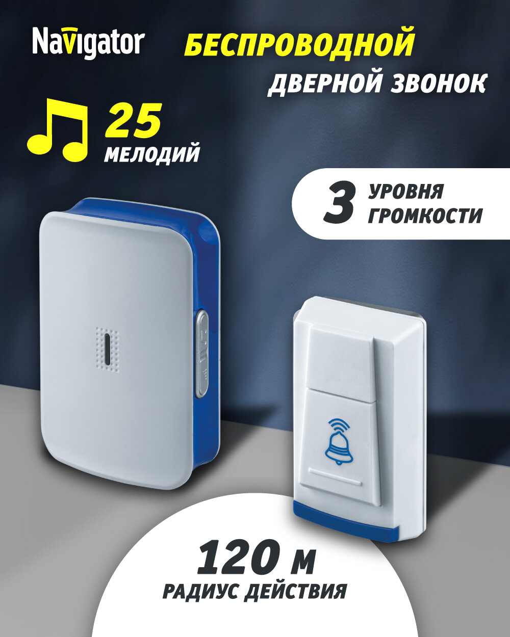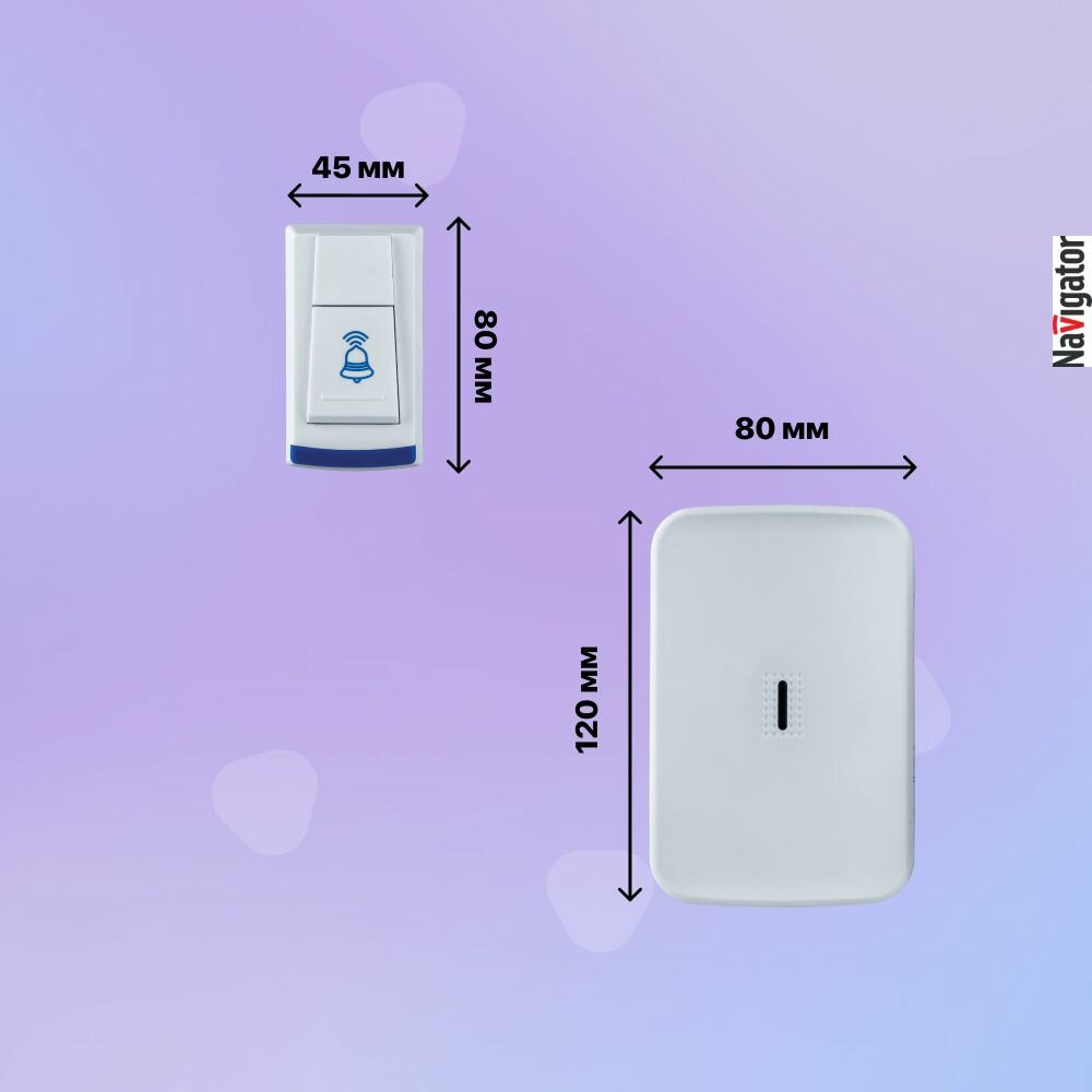 Откройте дверь к миру комфорта и безопасности с нашим беспроводным дверным звонком! Этот умный гаджет спроектирован для использования как в квартире, так и для уличных условий, обеспечивая непревзойденную удобство и качество. Отличительной чертой звонка от Navigator является звонкий и чистый звук, который не позволит пропустить ни одного гостя или курьера. Использование беспроводной технологии облегчает установку – нет необходимости бурить стены прокладывать кабели. Ваш новый дверной звонок можно легко прикрепить к любой двери, не нарушая ее целостность, для его работы вам лишь потребуется приобрести 3 пальчиковые батарейки, для кнопки батарейки не нужны, они поставляются в подарок. Для вашего звонка вы можете выбрать одну из 36 полифонических мелодий, а также регулировать его громкость (3 уровня). Радиус действия беспроводного звонка на открытом пространстве до 120 метров. Уникальный код кнопки гарантирует защиту от ложного срабатывания. Качественный высокочастотный динамик обеспечивает чистое, сбалансированное звучание. Кнопка звонка защищена от дождя и снега, поэтому может использоваться не только на входной двери в квартиру, но и отлично подойдет для калитки на даче или в частном доме.