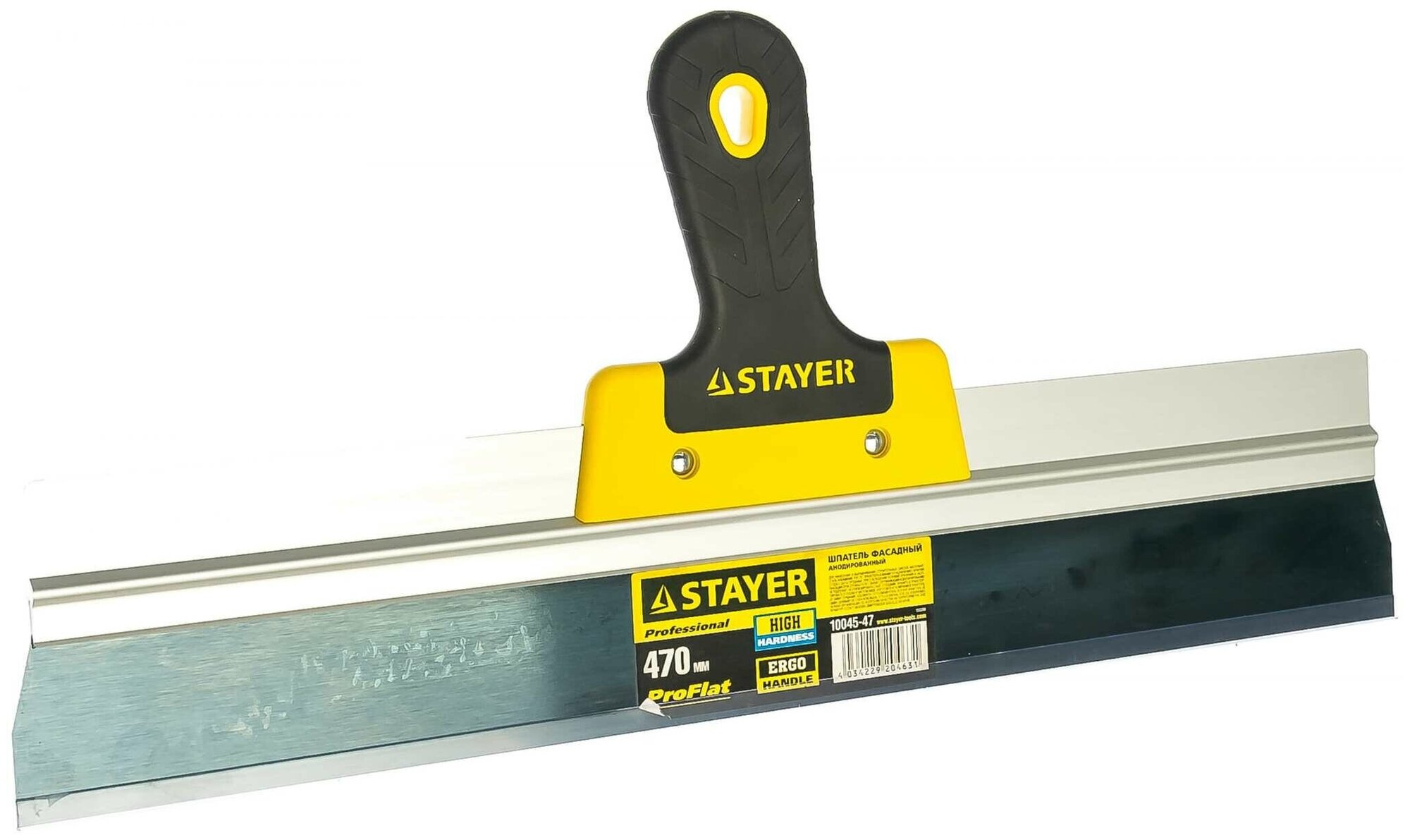 Шпатель фасадный STAYER PROFESSIONAL, анодированный, двухкомпонентная рукоятка ( 10045) Шпатель фасадный STAYER PROFlat, серия PROFESSIONAL – строительный шпатель профессиональной серии с полотном из анодированной стали, алюминиевой направляющей и эргономичной рукояткой из термопластичной резины для нанесения и последующего выравнивания шпатлевки и других строительных смесей на больших поверхностях. • Анодированное стальное полотно надежно защищено от коррозии. • Алюминиевая направляющая придает конструкции дополнительную прочность, исключая возможность искривления полотна. • Эргономичная мягкая двухкомпонентная рукоятка из термопластичной резины обеспечивает комфортную работу и надежный захват.Незаменимый инструмент при работе с различными строительными смесями на больших поверхностях. Полотно из анодированной стали высокой прочности обеспечивает надежность и долгий срок службы инструмента, алюминиевое ребро жесткости предотвращает искривление полотна, а эргономичная двухкомпонентная рукоятка снижает утомляемость, создавая комфорт при работе.-Вид шпателя: фасадный -Ширина полотна: 470 мм-Материал полотна: сталь -Материал ручки: ТПР, ПП