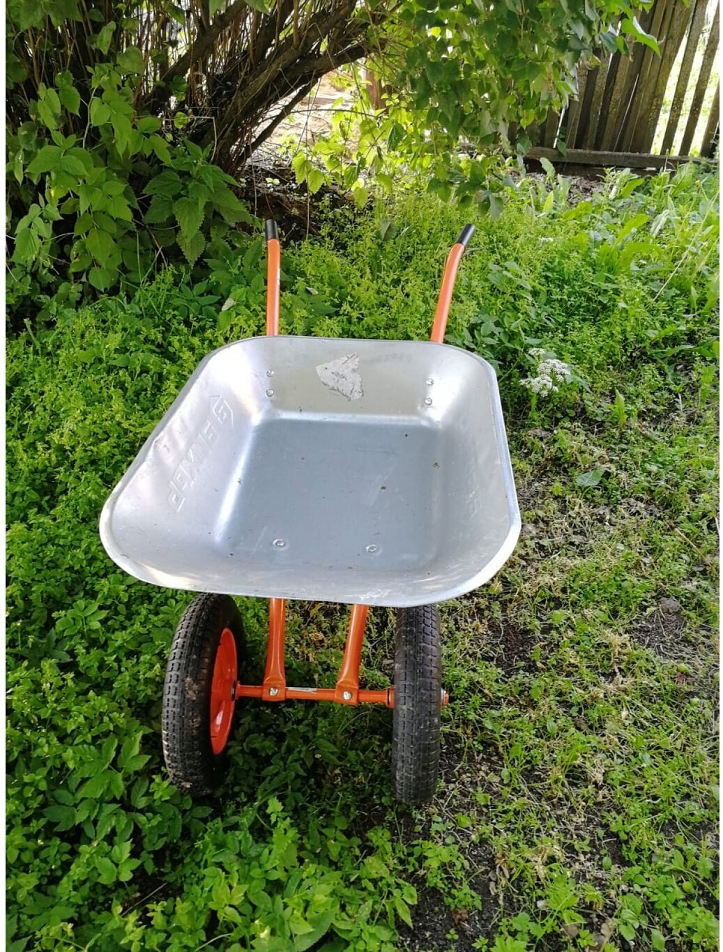 Собрали ее с трудом. У ручек не совпадали отверстия соединения с кузовом снизу, нужно было приложить много усилий, чтобы их состыковать. У детали, к которой крепятся колеса, вообще отверстия были другого диаметра, болты туда не проходили, пришлось разсверливать. Сама тачка легкая, удобная. Посмотрим, как прослужит.