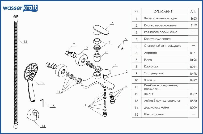 | ВКоробке | Смеситель - 1 шт. Лейка - 1 шт. Шланг - 1 шт. Настенный держатель - 1 шт. Эксцентрик - 2 шт. Набор креплений - 1 шт. Инструкция - 1 шт. |
