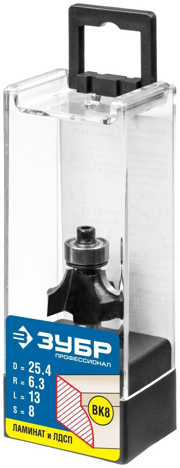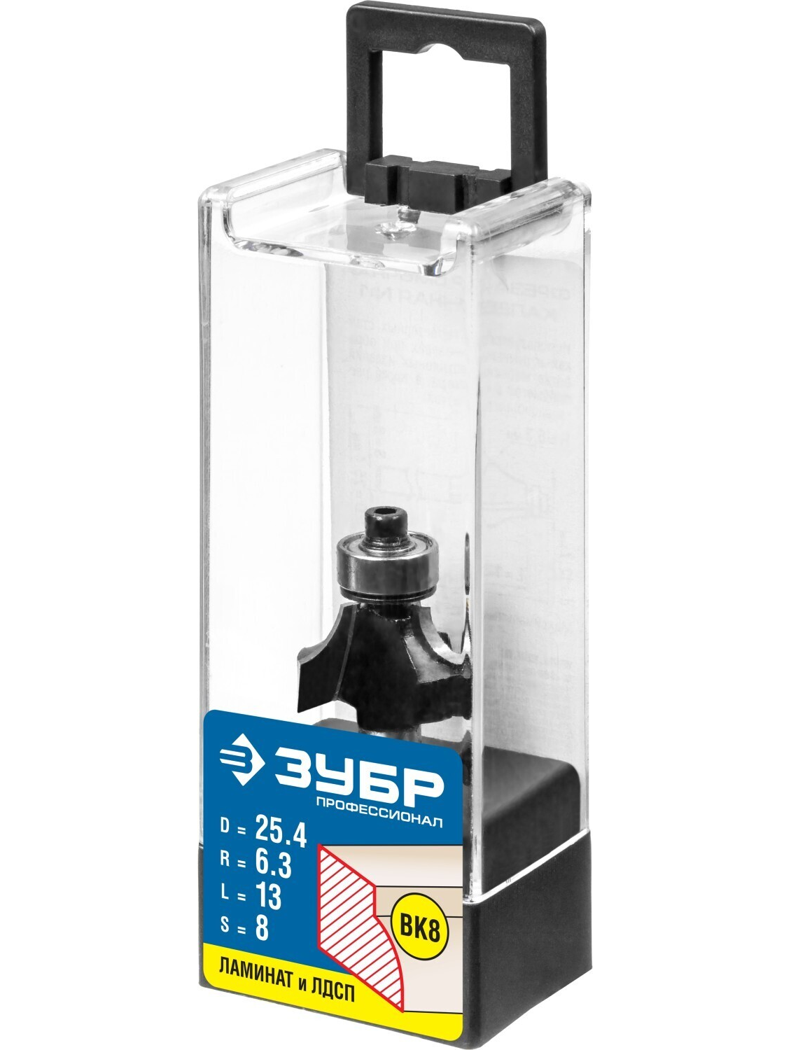 Фреза ЗУБР "ПРОФЕССИОНАЛ" кромочная калевочная №1, диаметр-25,4 мм, рабочая длина-13 мм, радиус-6,3 мм, хвостовик-8 мм, диаметр подшипника-12,7 мм
