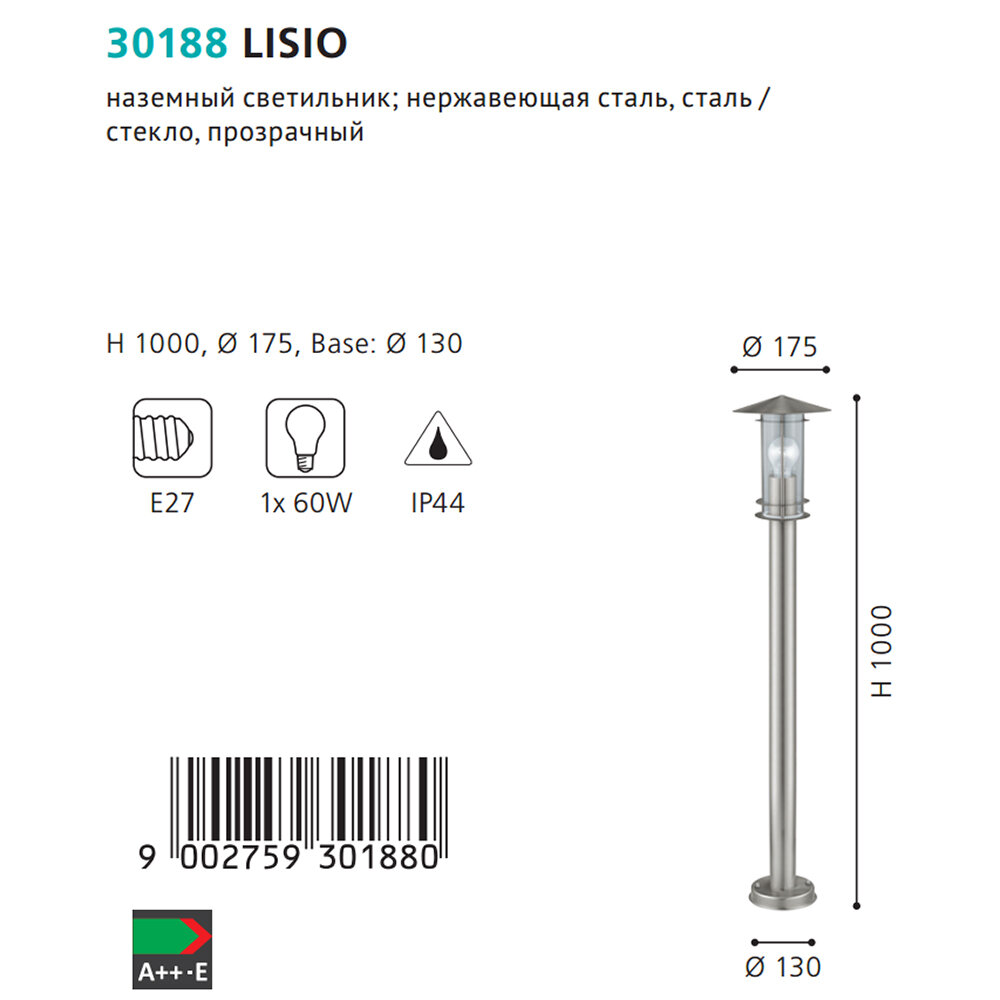 Наземный светильник уличный Lisio - продукт известной компании Eglo (Австрия). Имеет максимальную мощность 60 Вт, освещает площадь до 3 кв. м. Отлично подойдет для таких мест, как дача, сад. Впишется в интерьеры следующих стилей: модерн, техно.