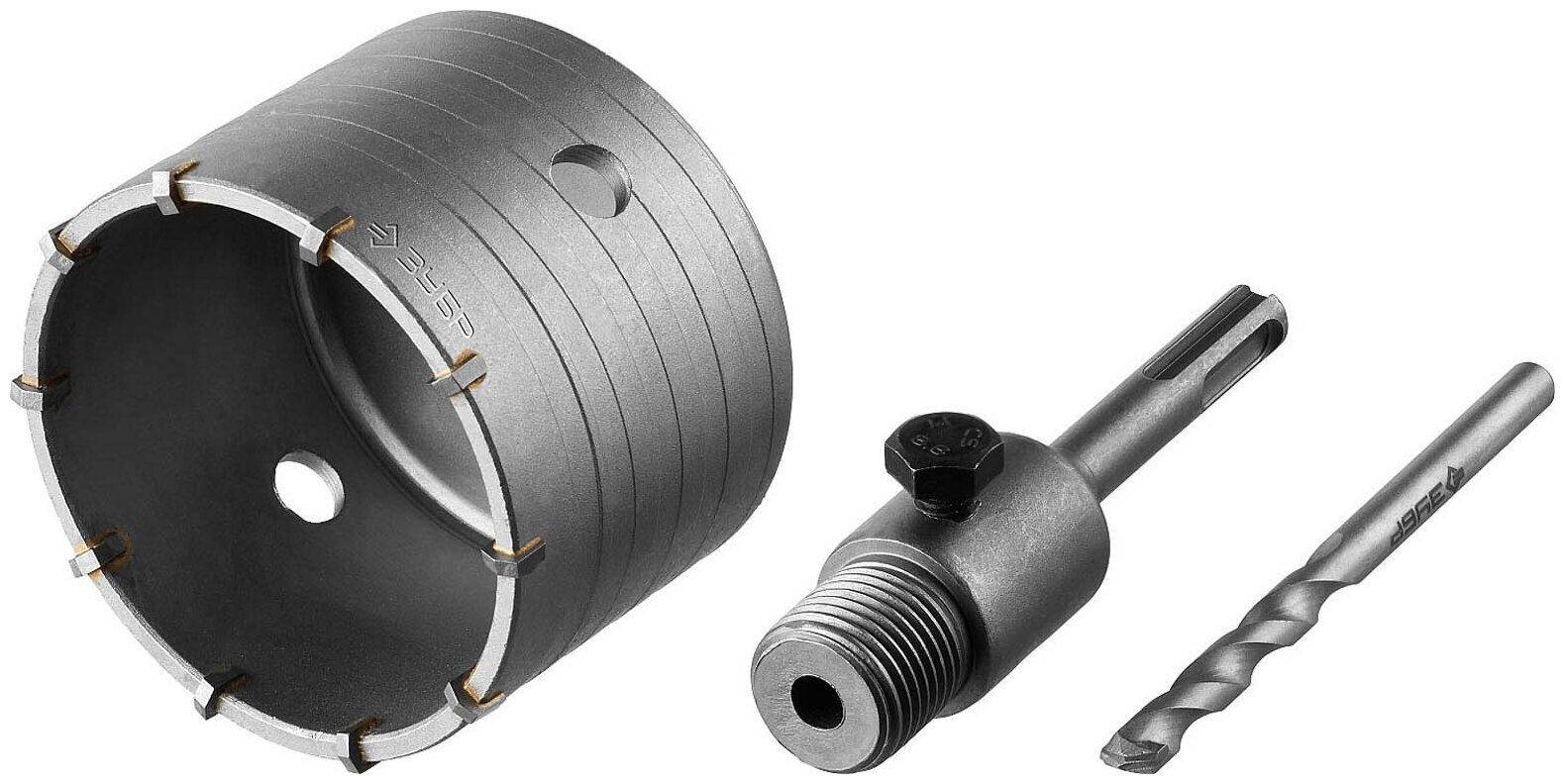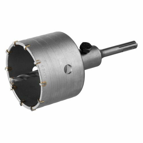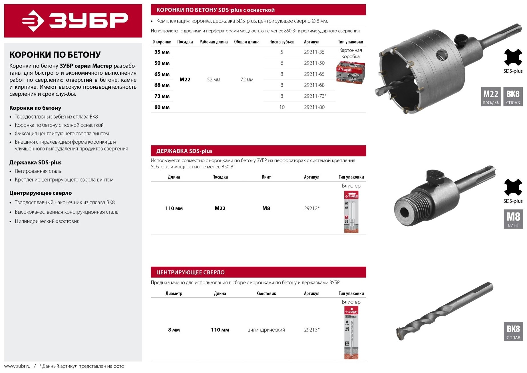 Буровая коронка ЗУБР , предназначена для сверления отверстий в бетоне, кирпиче, природном и искусственном камне, а также плотных известняках. Используется с дрелями и перфораторами мощностью не менее 850 Вт в режиме ударного сверления. Твердосплавные зубья из сплава ВК8 позволяют эффективно дробить обрабатываемый материал. Специальная спиралевидная форма корпуса коронки из высокопрочной стали уменьшает трение о стенки отверстия, ускоряет отвод шлама и повышает срок службы инструмента. Коронка по бетону с полной оснасткой. Державка SDS-plus из легированной стали. Резьбовая посадка М22 обеспечивает надежное крепление коронки с державкой. Фиксация центрирующего сверла винтом. Износостойкое покрытие защищает от коррозии.
