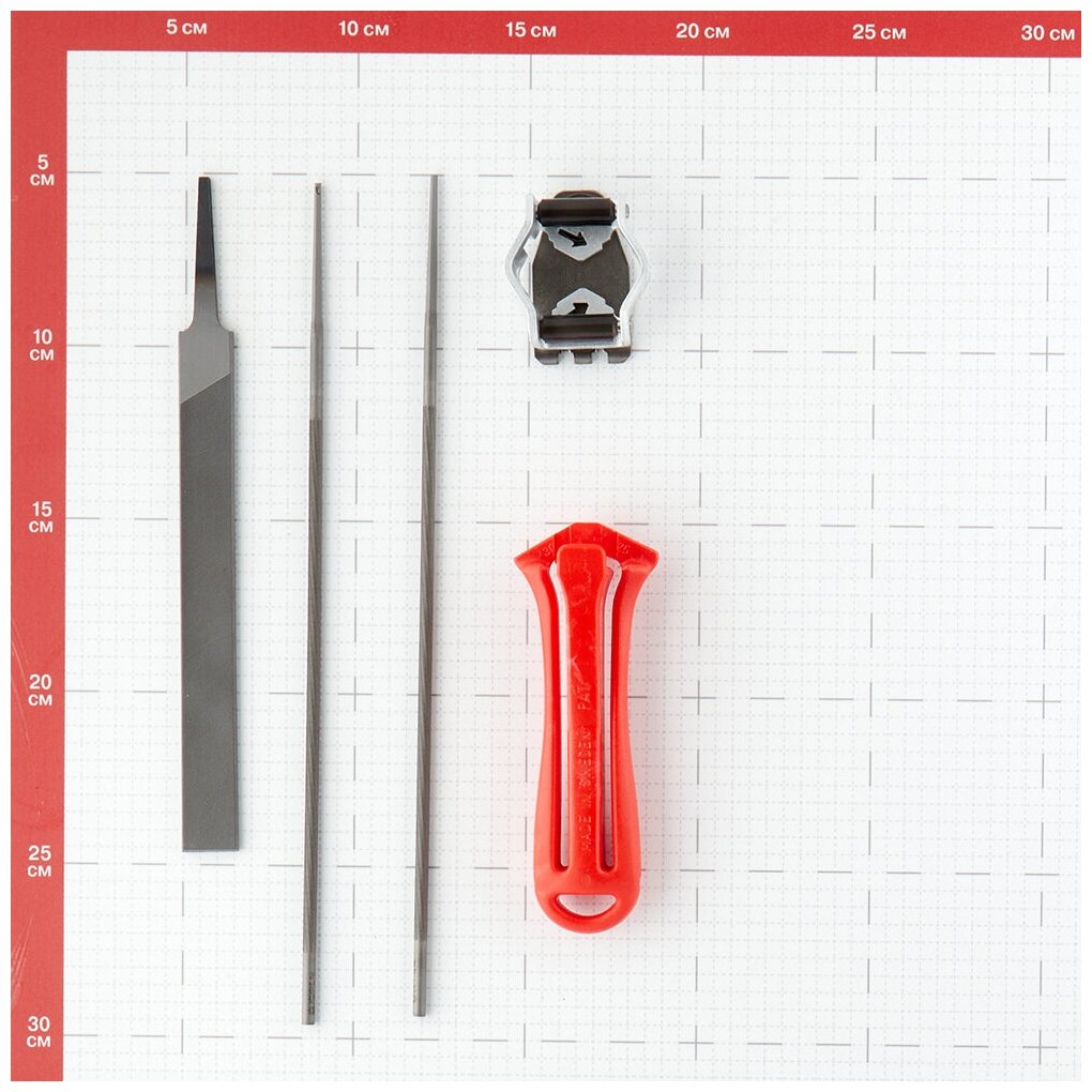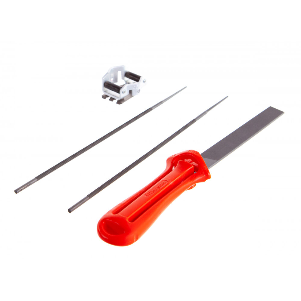 | Состав набора | рукоятка для напильника - 1 шт.; круглый напильник - 2 шт.; шаблон для заточки - 1 шт.; ограничитель глубины реза - 1 шт.; плоский напильник - 1 шт. |