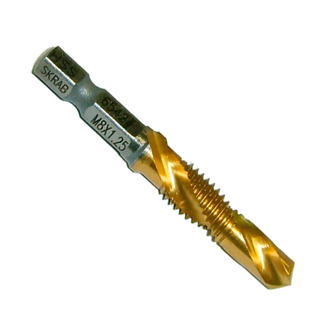 Сверла-метчики изготовлены из быстрорежущей стали HSS с нитридтитановым покрытием, что увеличивает;прочность и долговечность сверл-метчиков SKRAB. Сверла-метчики Scrab имеют шестигранный хвостовик, позволяющий применять их в шуруповёртах и способствующий лучшей фиксации метчика в кулачковом патроне.