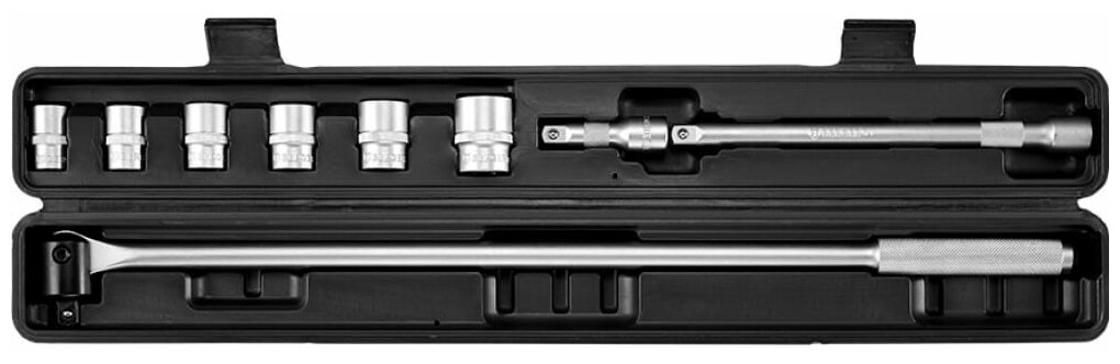 | Подробный состав комплекта | Головки торцевые 6-гранные:17, 19, 21, 22, 24, 27 мм. Удлинитель 75, 250 мм. Вороток шарнирный усиленный 600 мм. Кейс. |