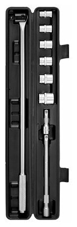 | В наборе | удлинитель (75, 250 мм), головка (6-гранная 17, 19, 21, 22, 24, 27 мм), вороток (600 мм, нагрузка в 826 Нм) |