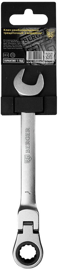 Ключ трещоточный с шарниром BERGER, полностью выполнен из инструментальной хромванадиевой стали, с антикоррозийным покрытием «Satin» (матовый хром). Храповый механизм трещоточных ключей BERGER имеет: 72 зубца, изготовлен из хроммолибдена (Cr-Mo). Твердость материала храпового механизма: 58HRC. Работает с болтом и гайкой: M12.Преимущества DIN 899 Сталь: Cr-V Твердость: 44-49 HRC Сталь храпового механизма: Cr-Mo Твердость храпового механизма: 58 HRC Угол наклона рожков 15° Шаг 5° (72 зубца) Шарнир (Ход шарнира 180°) позволяет повысить функциональность ключа при работе в труднодоступных местах Двухсторонняя маркировка ключа облегчает идентификацию