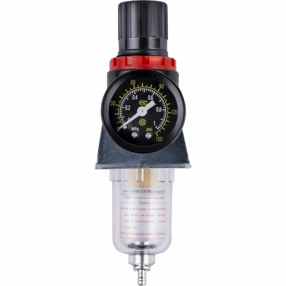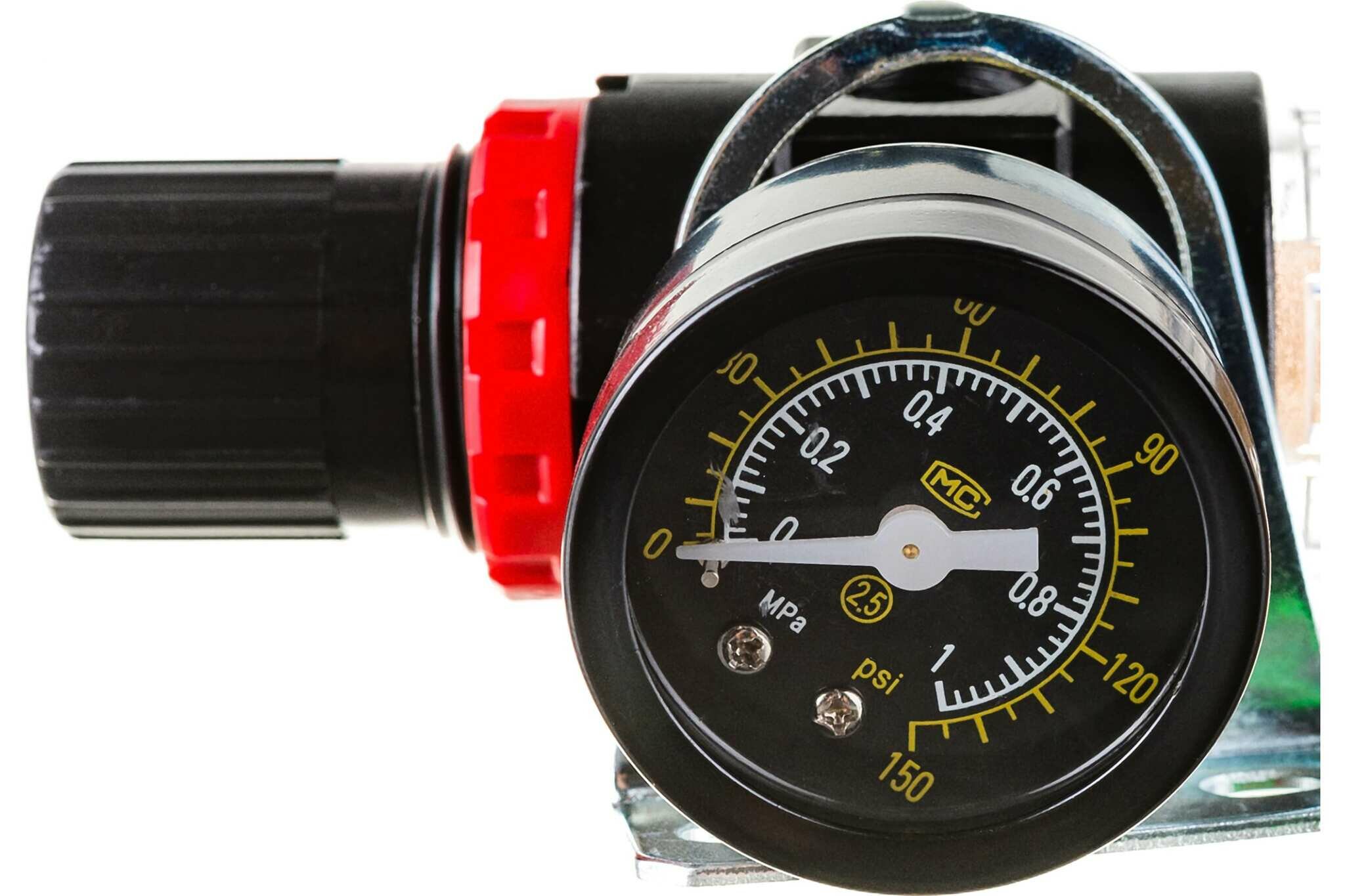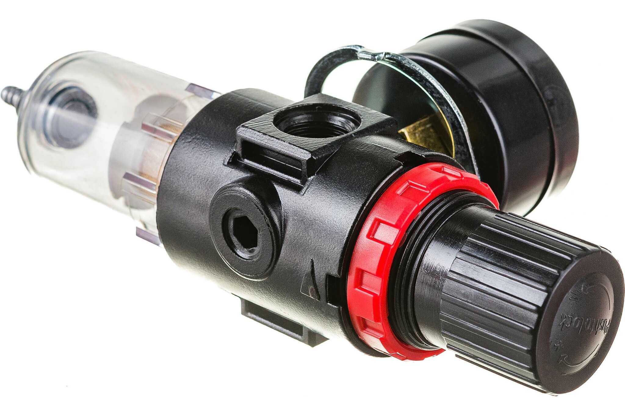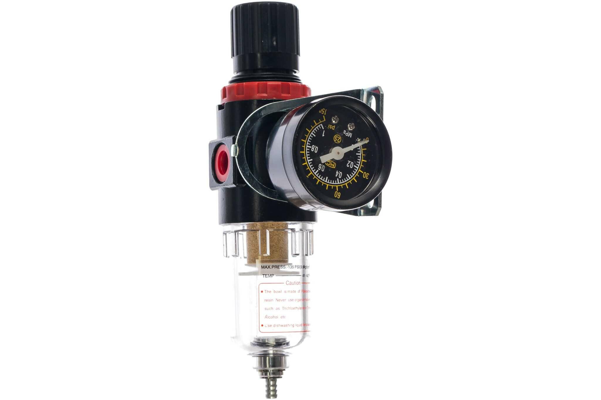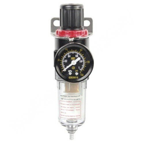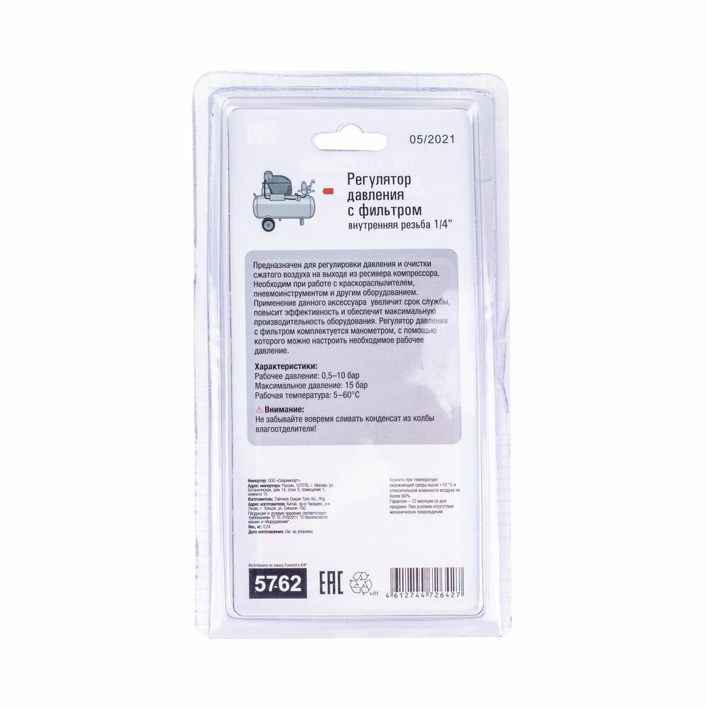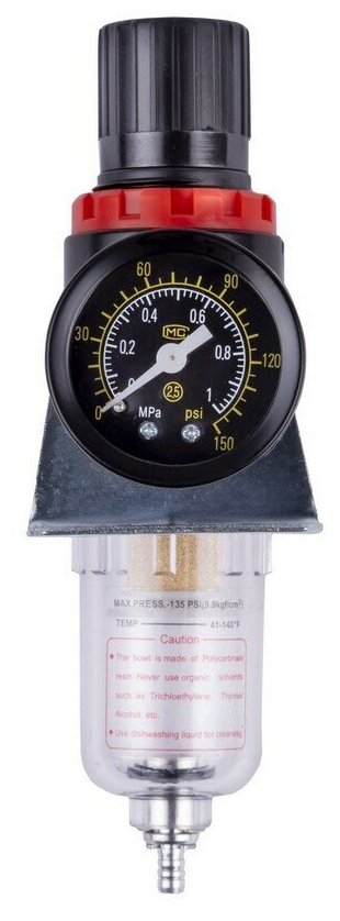 Регулятор давления FoxWeld 5762 предназначен для регулировки давления, очистки и осушения сжатого воздуха. Устанавливается на выходе из ресивера компрессора. Регулятор давления необходим при работе с краскораспылителем, пневмоинструментом и другим оборудованием. Применение данного аксессуара увеличит срок службы оборудования, повысит эффективность и обеспечит его максимальную производительность. Оснащён осушителем центробежного типа. Чем быстрее поток воздуха внутри и заданное выходное давление, тем лучше влагоотделение. Помните о необходимости отвода конденсата из колбы влагоотделителя (осушителя). Регулятор давления с фильтром комплектуется манометром, с помощью которого можно выставить необходимое давление на выходе. Комплектуется встроенным кронштейном для крепления на стенуПреимущества Присоединительные параметры: 1/4"F - 1/4"F (внутренняя резьба на входе и выходе) Рабочее давление: 0,5 - 10 бар Максимальное давление: 15 бар Манометр 50 мм Фильтр-осушитель центробежного типа, с колбой с фильтром и клапаном для отвода конденсата Встроенный крепёжный кронштейн