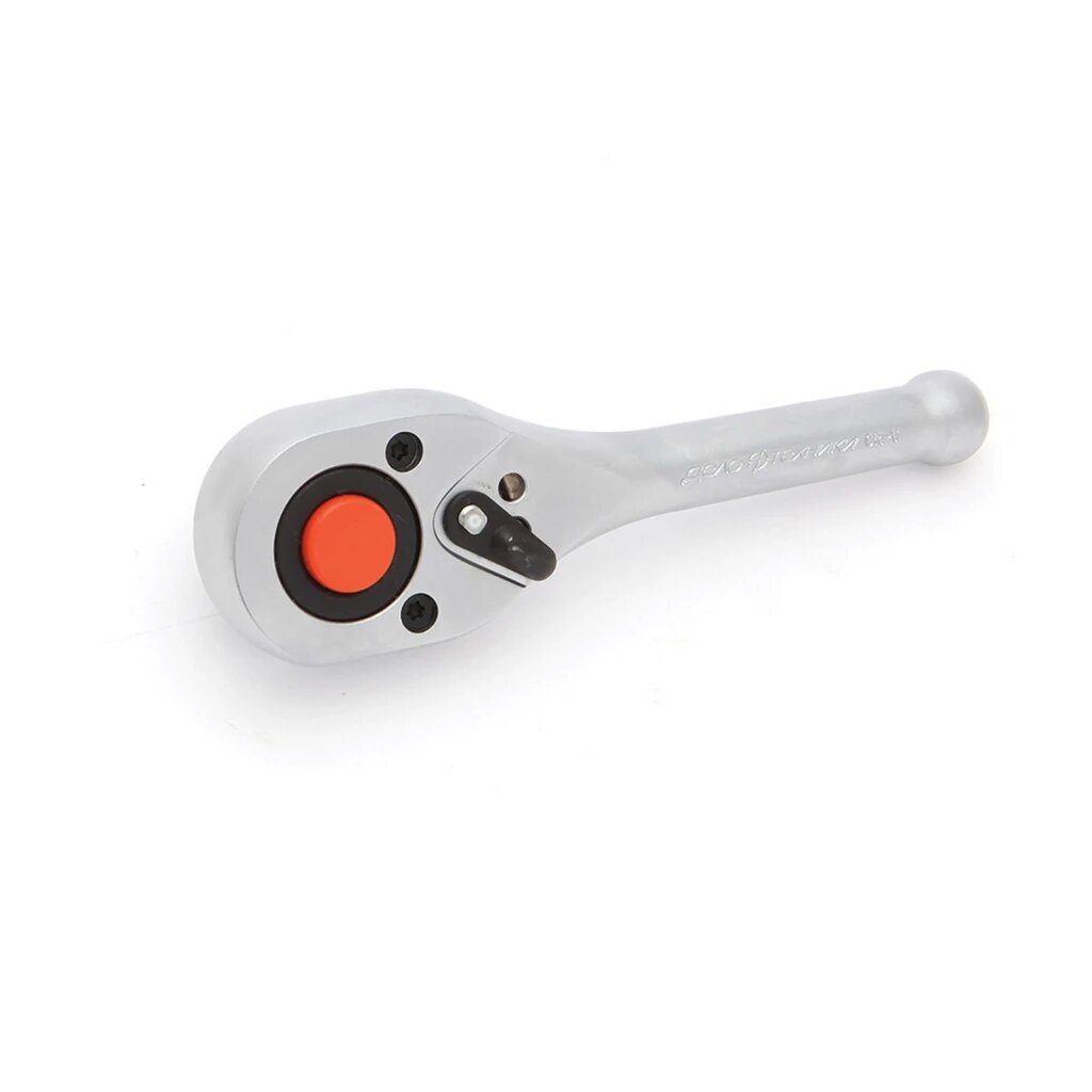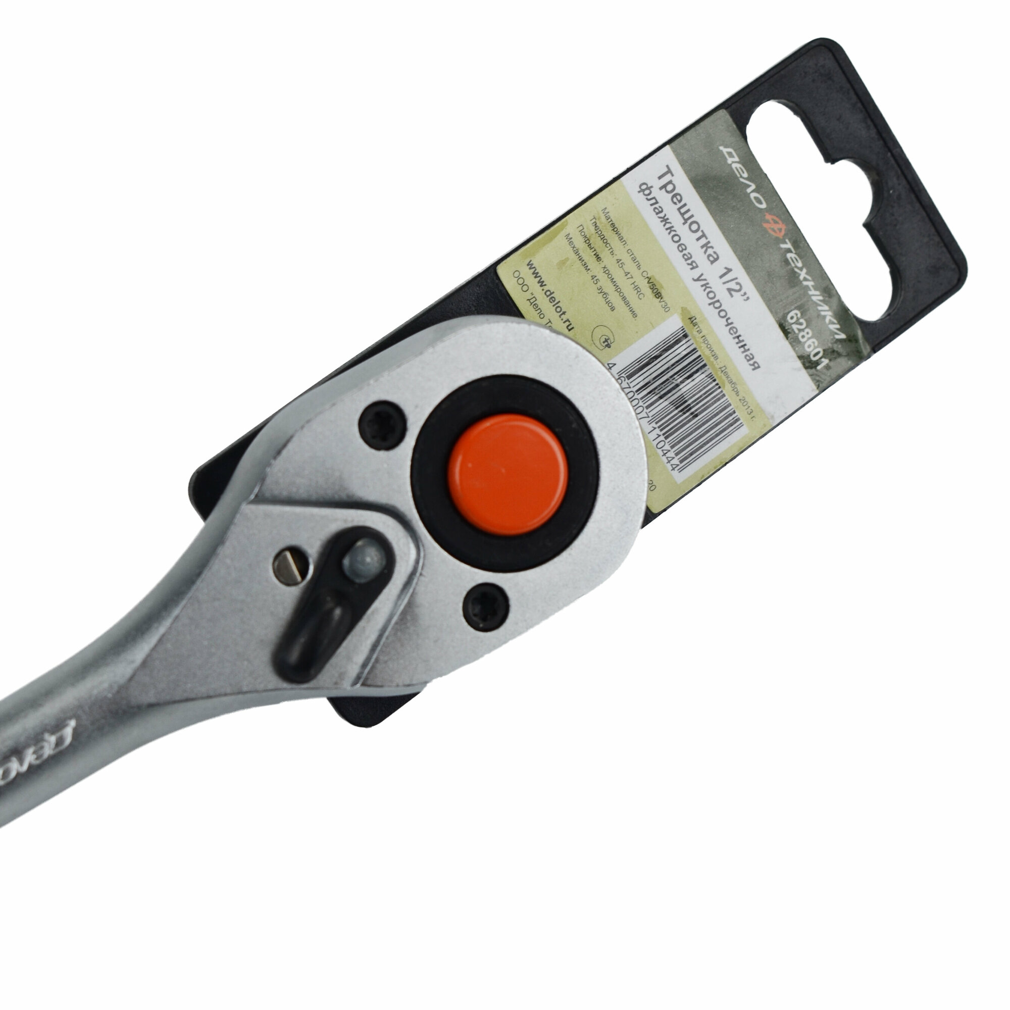 Храповый механизм: 45 зубцов.Длина трещотки: 135 мм.Трещоточные приводы ускоряют процесс работы с крепежом, а также позволяют быстро изменить направления вращения и размер используемой головки.Укороченная конструкция трещотки позволяет работать в ограниченном пространстве.Дополнительным преимуществом при работе с трещоткой является возможность комбинировать привод с удлинителями различной длины, а также карданными шарнирами и переходниками.В конструкции трещоточного (храпового) механизма применяется зубчатый барабан, выполненный как одно целое с присоединительным квадратом и кнопкой отсоединения головки. Блокировка вращения зубчатого барабана осуществляется одной из двух подпружиненных собачек. Изменение направления вращения храповика осуществляется переключателем, к которому присоединён флажок - переключатель.Трещотка не предназначена для страгивания и силовой протяжки крепежа, для этого применяются воротки или гаечные ключи.Сталь: CrV50Bv30Твёрдость: 45 — 47 HRCХромирование