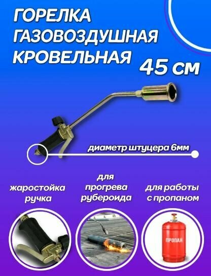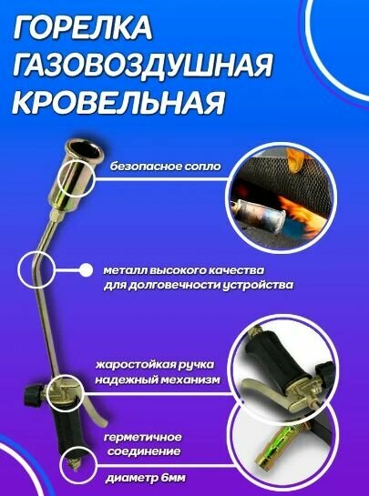 Горелка кровельная воздушная пропановая предназначена для смешения горючего газа (пропан-бутановая смесь) с атмосферным воздухом и сжигания в атмосфере. Горелка оборудована регулировочным вентилем, применяется для кровельных работ, сушки и нагрева панелей и форм, кирпичной кладки, сжигания травы, дорожных работ. Основные параметры горелки соответствуют требованиям ГОСТ 29091-91 «Горелки ручные газовоздушные инжекторные».