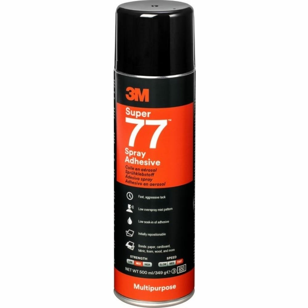 Клей-спрей универсальный 3М Super 77, белый, 500 мл безопасен для фотографий, не пропитывает их и не вызывает пожелтения. Уже более 50-ти лет клей 3M Super 77 используется на производствах, требующих быстрой и прочной склейки. 3M Super 77 имеет высокую начальную прочность, однако, допускает переклеивание в случае ошибки. Клей не пропитывает пористые материалы, не разрушает пенопласт и другие деликатные поверхности, образует мягкий, эластичный клеевой шов - все это делает его идеальным для самых различных применений, таких как ремонт, строительство, производство транспорта. Типичные области использования: ремонт и обслуживание, крепление шумо или теплоизоляции, крепление тонких пленок и фольги, сборка сувениров и багетов, полиграфия. -Высокая липкость позволяет быстро получить прочное соединение. -Точное распыление. -Не проникает в структуру материала, остается на поверхности. -Допускает кратковременное переклеивание. -Имеет высокую прочность, необходимую для промышленных применений. -Позволяет проводить соединение в течение 15 секунд-30 минут. Подходит для легких материалов. Склеивает бумагу, холст, картон, дерево, пенопласт, ткани, фольгу, пластики, шумоизоляцию и т. д.