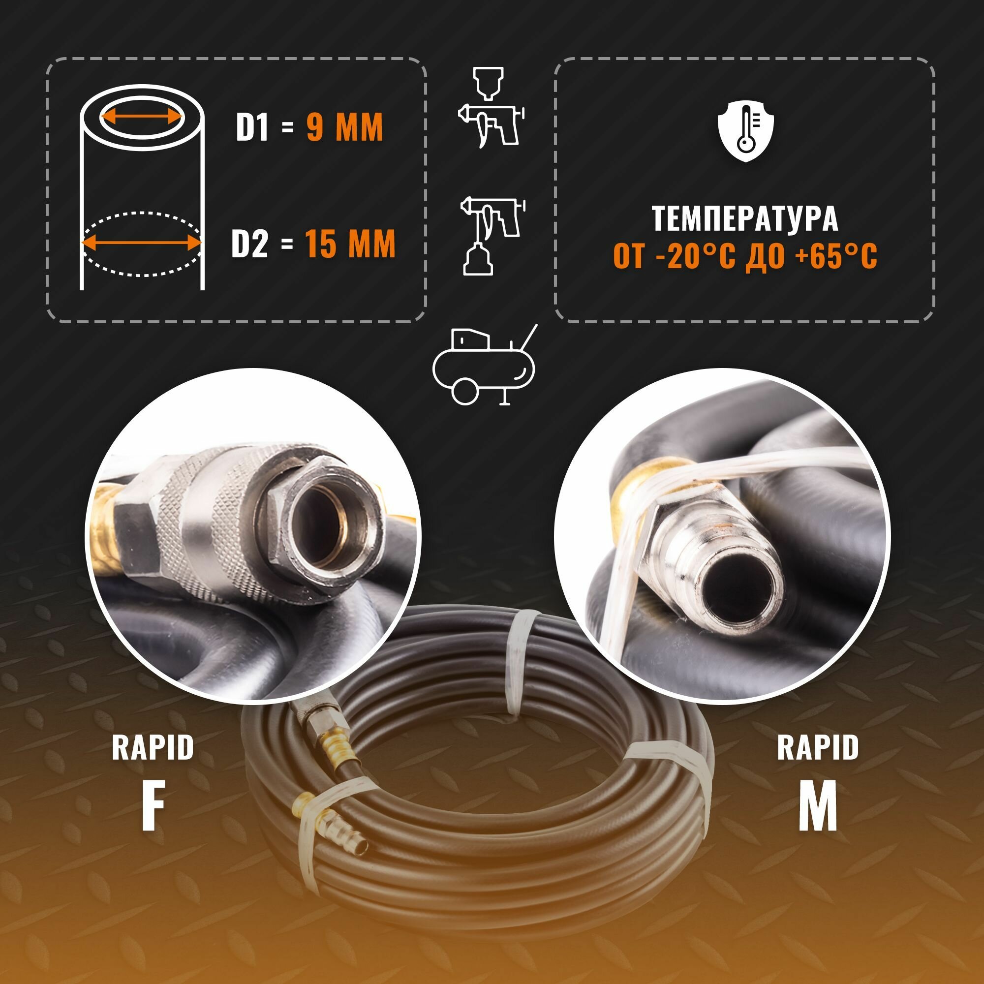 Шланг воздушный FoxWeld предназначен для подключения пневмоинструмента к компрессору. Он имеет длину 10 метров, внутренний диаметр 9 мм и внешний 15 мм, с фитингами типа Rapid для быстрого соединения. Рабочие характеристики включают давление до 20 бар (максимум 25 бар) и материал из маслостойкой резины на основе полиуретана.Преимущества Увеличенная пропускная способность благодаря диаметру 9 мм для эффективной работы инструмента Высокая маслостойкость и износоустойчивость, подходит для компрессоров с масляной смазкой Универсальность и надежность: не дубеет на морозе, простое соединение Rapid F-M