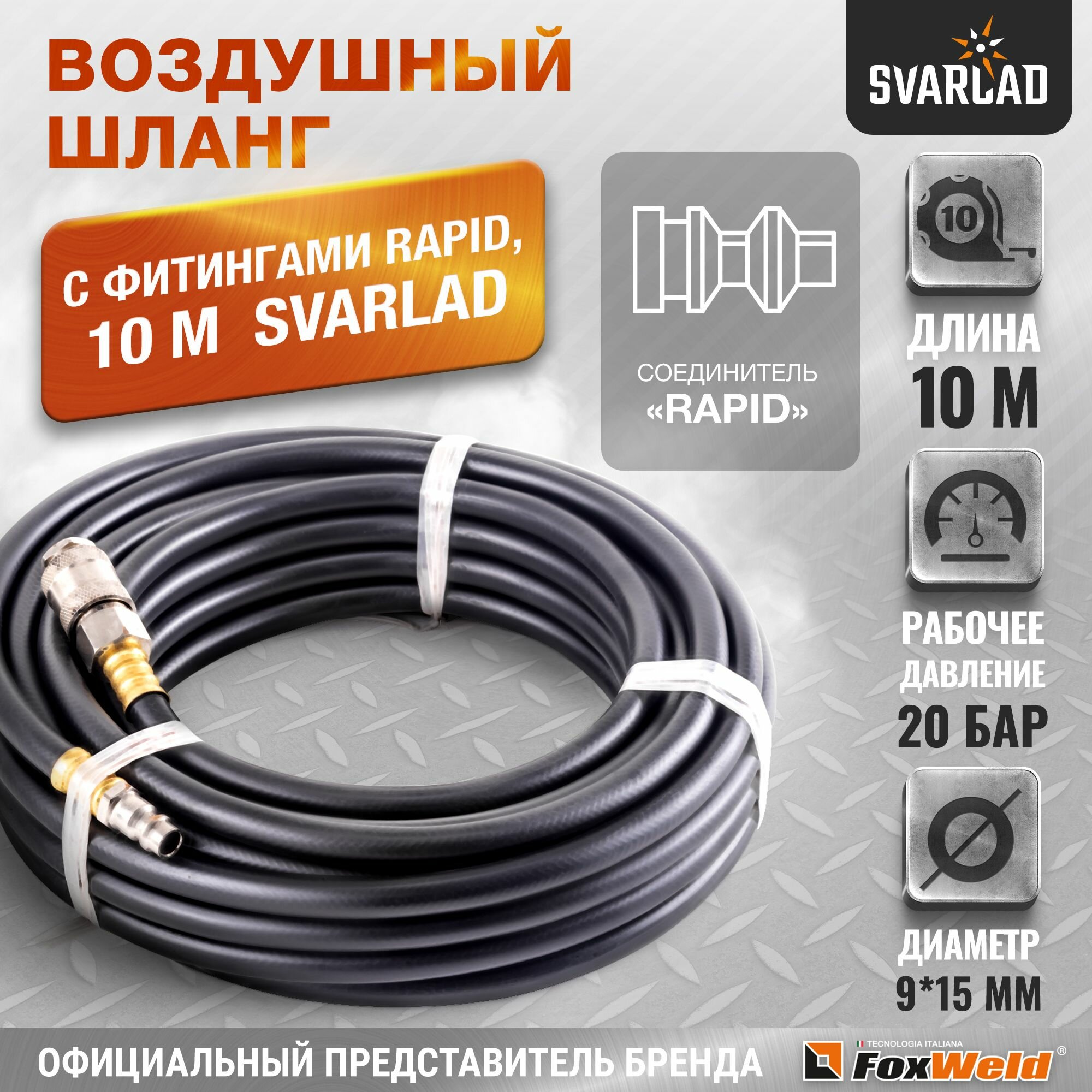 | Доп. наименование Водопад | Шланг воздушный резиновый FoxWeld Aero 6510, маслостойкий с фитингами Rapid, 20 бар, 19х15 мм, 10 м |