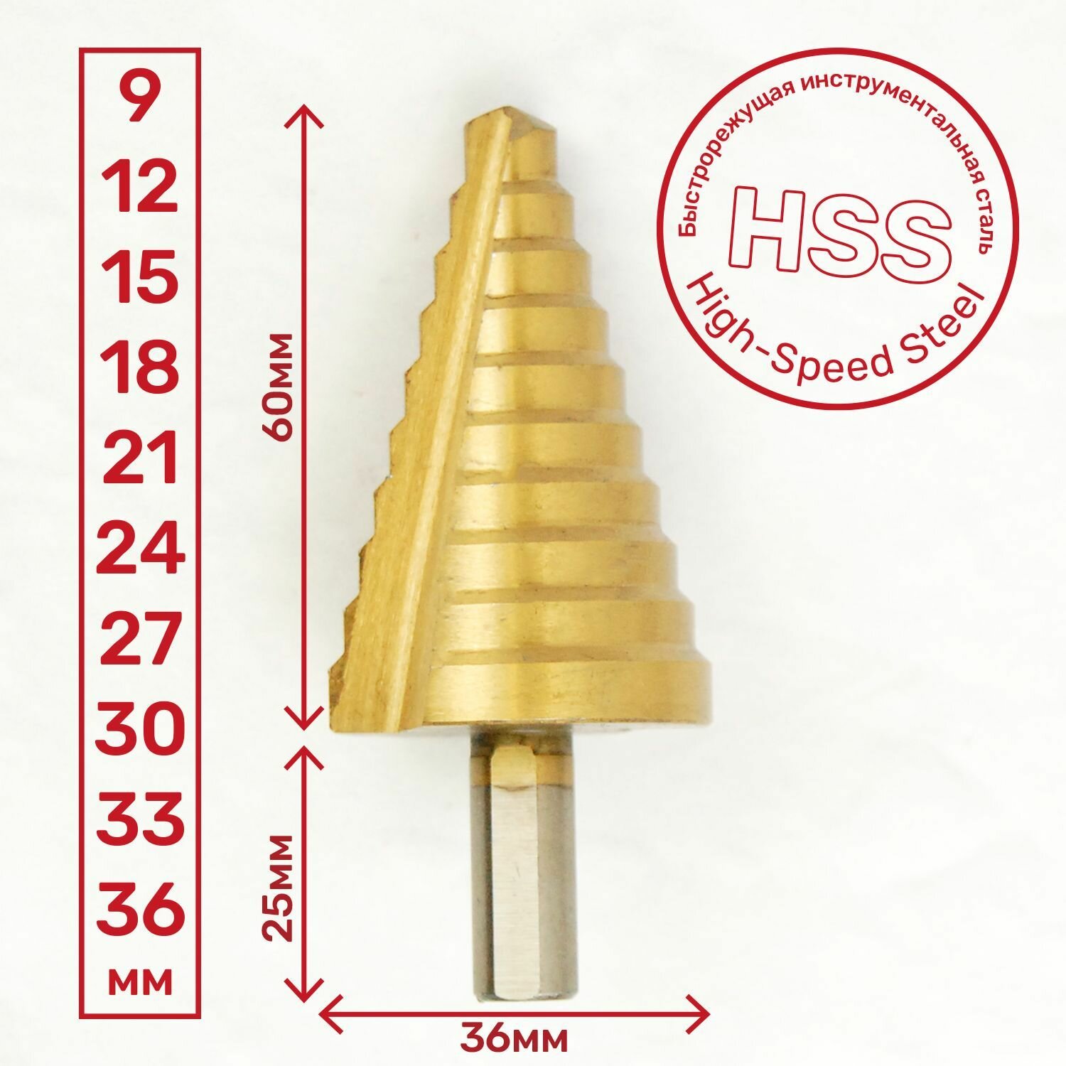 | Комплект поставки | Сверло по металлу ступенчатое 9-36мм |