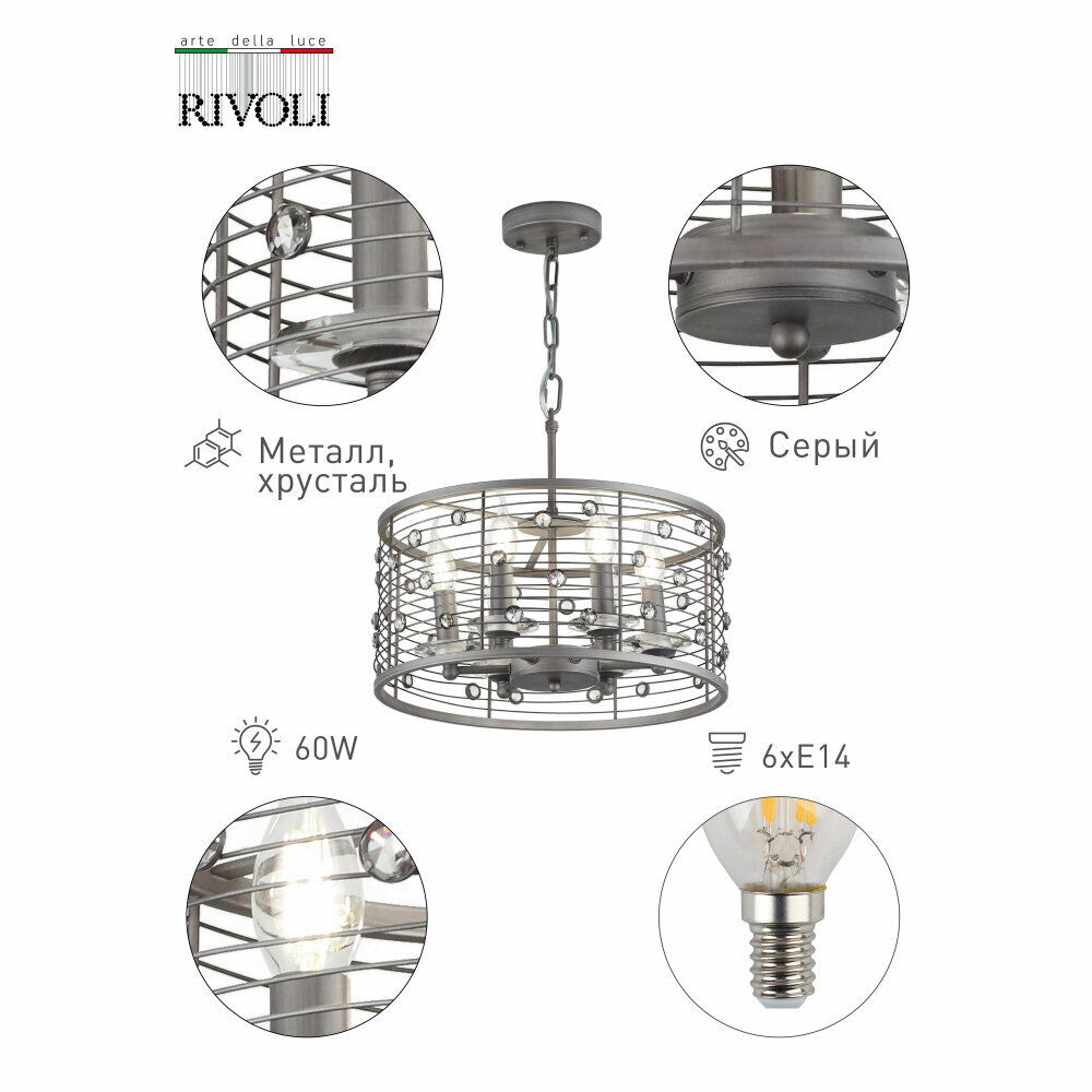 Rivoli Б0038081 Дизайн люстр и светильников RIVOLI - результат творчества итальянских мастеров. Разноплановая креативная группа создает интерьерное освещение различных стилевых решений - от ультрамодного модерна до неоклассики. Следование модным трендам при соблюдении европейских традиций - характерная черта марки RIVOLI. Функциональность, дизайн, качество - три кита, на которых построена торговая марка RIVOLI.