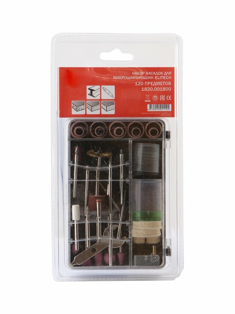 Садовый инструмент Elitech Набор оснастки (120 предметов) Elitech 1820.001800 предназначен для использования с гравировальными машинками. Включает в себя предметы различной формы и зернистости для выполнения работ высокой сложности. Основное назначение - шлифовка, резка и полировка древесины, металла, пластика и т.д.