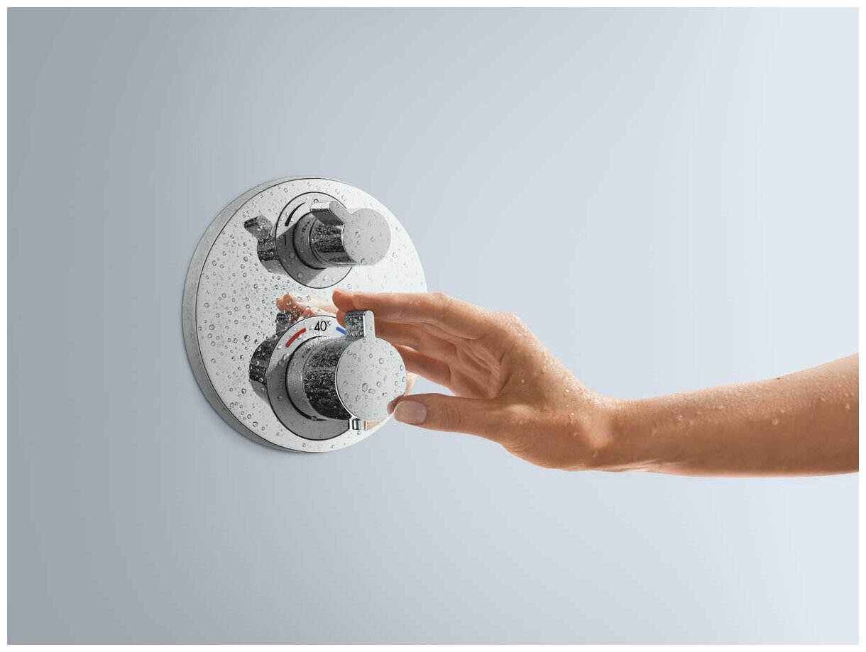 Cмеситель Hansgrohe Ecostat S 15757000 (внешняя часть). Цвет хром. 1 потребитель. Картридж термостата, с керамическим вентилем 90. Предохранительный ограничитель при 40C. Регулируемое ограничение температуры. Вид соединения: скрытая часть. Скрытая часть заказывается отдельно (Hansgrohe 01800180).