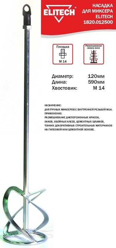 Садовый инструмент Elitech ELITECH 1820.012500 М14 - насадка для миксера. Подходит для ручных миксеров со внутренней резьбой М14. Применяется при размешивании дисперсионных красок, лаков, обойных клеев, цементных шламов, тонких декоративных строительных материалов на гипсовой или цементной основе.