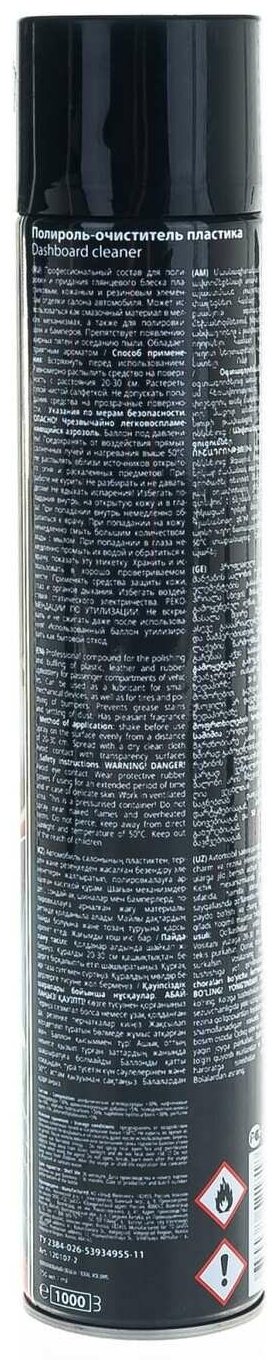 Профессиональный состав для полировки и придания глянцевого блеска пластиковым, кожаным и резиновым элементам отделки салона автомобиля. Может использоваться как смазочный материал в мелких механизмах и для полировки шин. Препятствует появлению жирных пятен и оседанию пыли. Обладает приятным ароматом вишни.