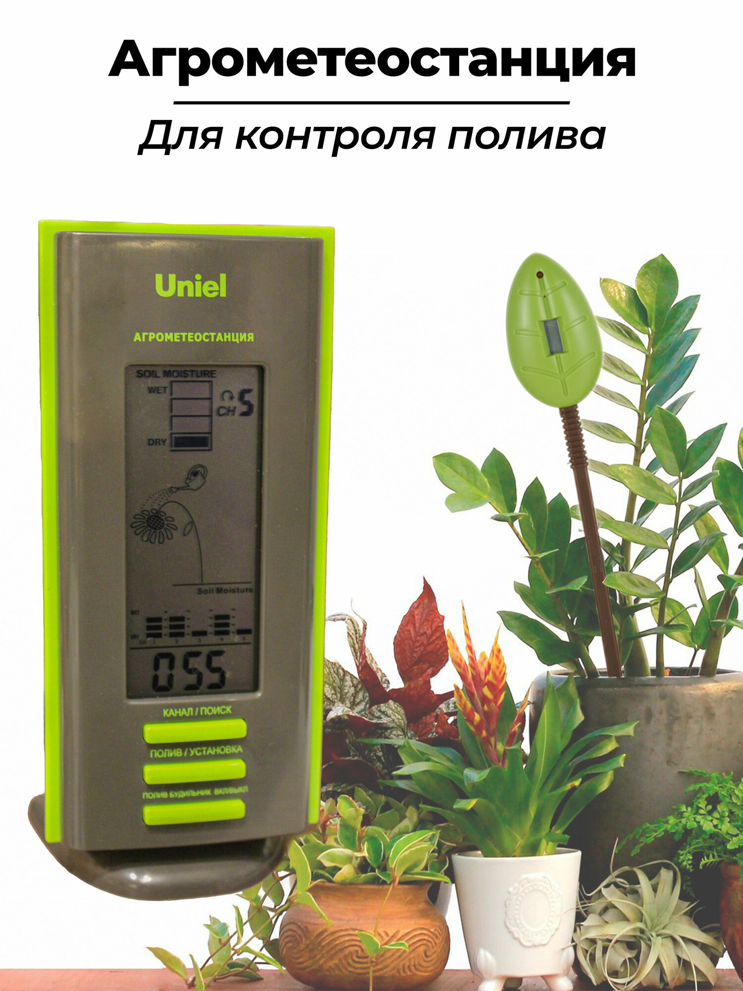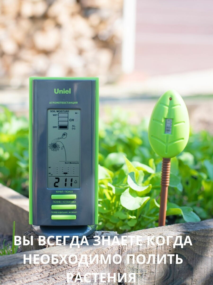 Настольная компактная метеостанция от торговой марки UNIEL модели представляет собой многофункциональное устройство. Здесь пользователь найдет и датчик влажности почвы с будильником для напоминания о необходимости полить растения (отличный подарок для любителей комнатных цветов); и показатели наружной температуры с уровнем относительной влажности; а также часы с будильником. А вся информация отображается на высокоинформативном жидкокристаллическом дисплее с анимацией.