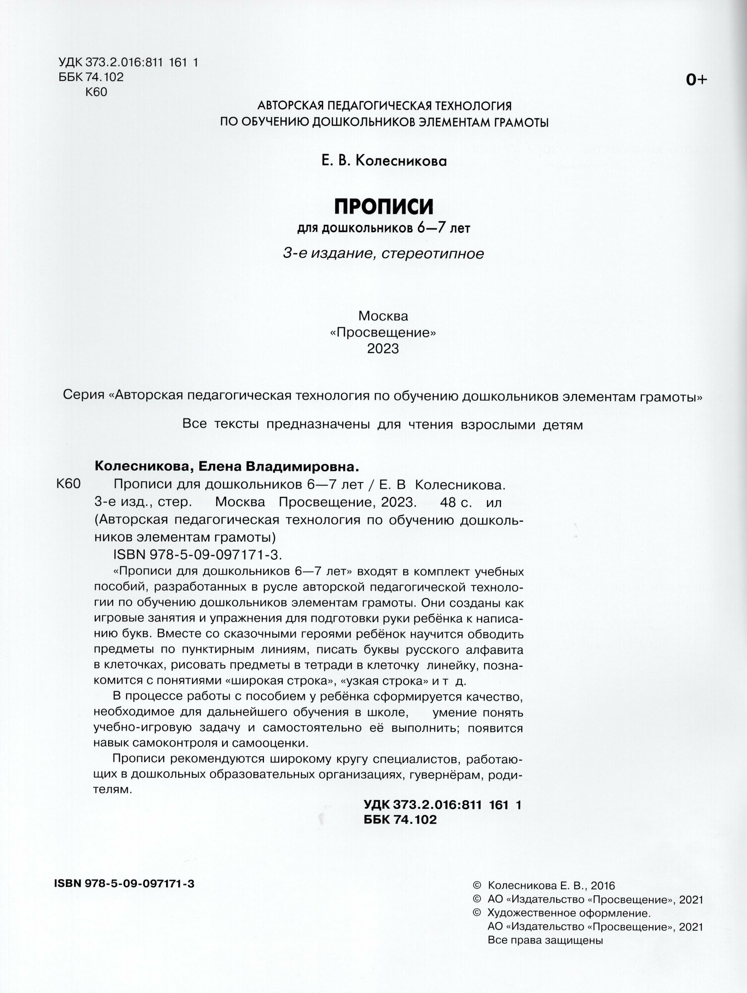 "Прописи для дошкольников 6-7 лет" входят в комплект учебно-наглядных пособий, разработанный в русле авторской педагогической технологии по обучению дошкольников элементам грамоты. Они предназначены для совместной работы взрослого с ребенком. Прописи сделаны как игровые занятия и упражнения для подготовки руки ребенка к написанию букв. Вместе со сказочными героями ребенок научится обводить предметы по пунктирным линиям, писать буквы русского алфавита в клеточке, рисовать предметы в тетради в клеточку, линейку, познакомится с понятиями широкая строка и узкая строка и т. д. У него сформируется качество, необходимое для дальнейшего обучения в школе, - умение понять учебно-игровую задачу и самостоятельно ее выполнить, появится навык самоконтроля и самооценки. Прописи рекомендуются широкому кругу специалистов, работающих в дошкольных образовательных организациях, гувернерам, педагогам групп кратковременного пребывания, учителям начальной школы, родителям.
