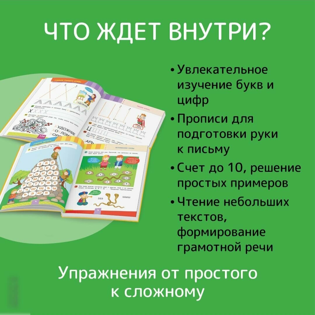 Самое то для дошкольного обучения! Это очень полезное мое приобретение, с трудом, но помогаю детям узнавать все, что им понадобится в следующем первом классе именно с помощью него. Все очень понятно и легко написано, помогает научить ребенка буквам, чтению, письму, цифрам, сложению и вычитанию! Само оформление яркое, бумага очень качественная, вполне приемлемая цена. Советую