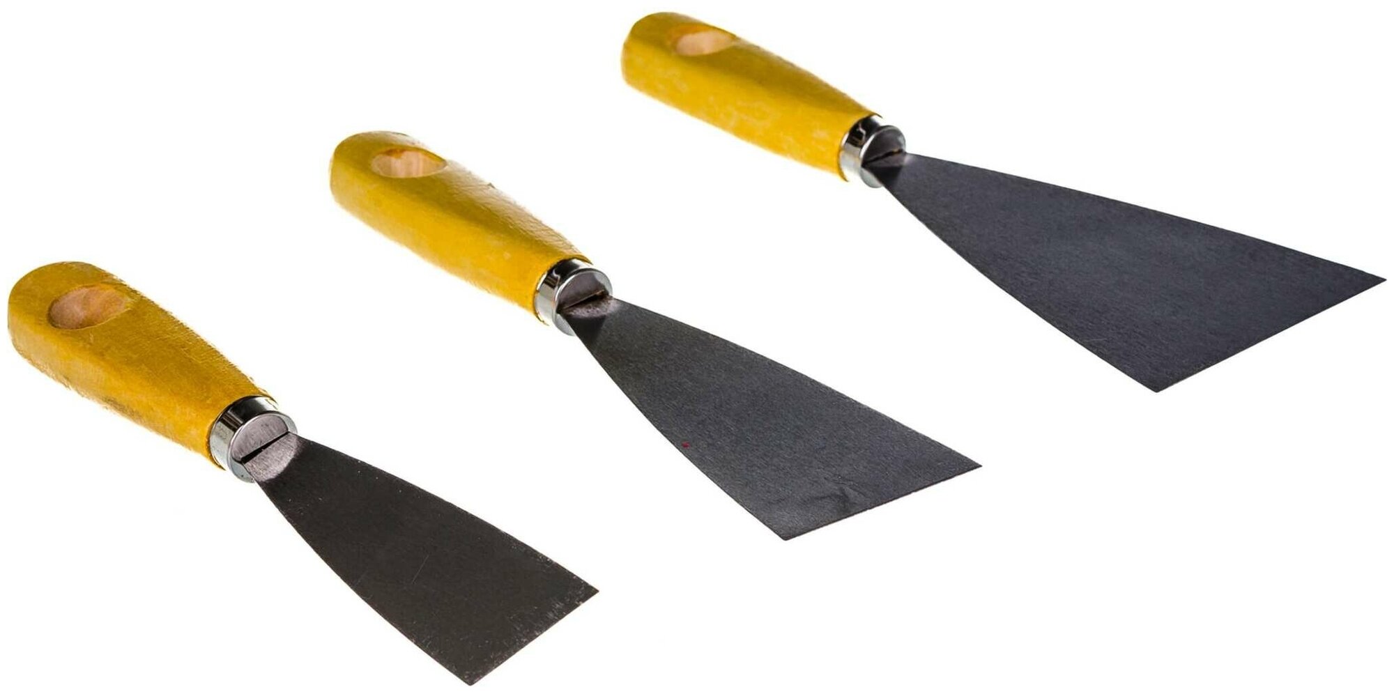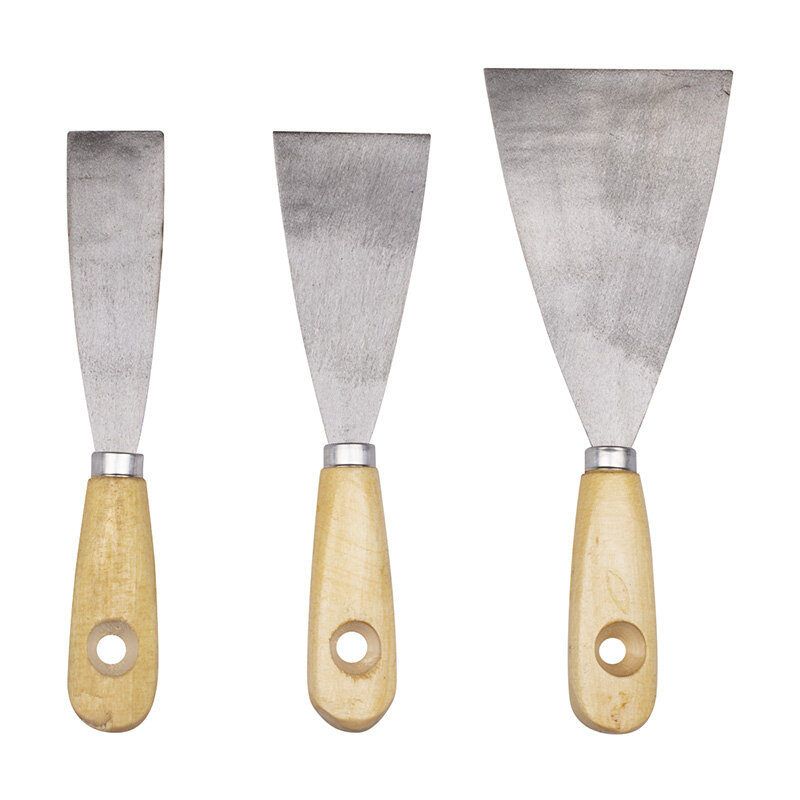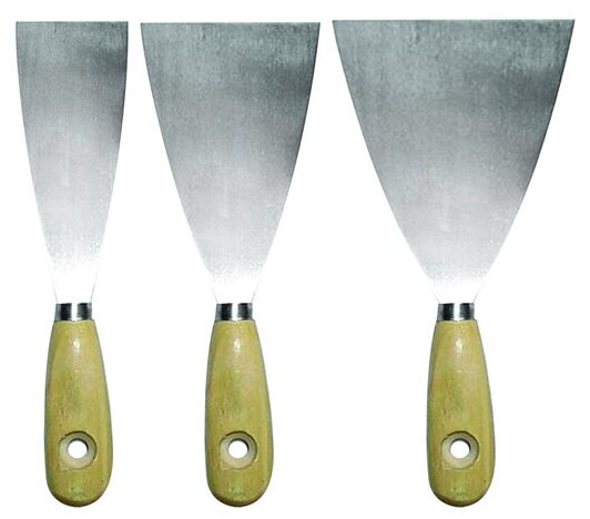 Бибер Набор шпателей с деревянной ручкой. Набор состоит из трех шпателей размеров 40, 60 и 80 мм. Используются шпатели для шпаклевания малых площадей и заполнения стыков. Ручки выполнены и из дерева и имеют эргономичную форму, рабочая поверхность из стали.