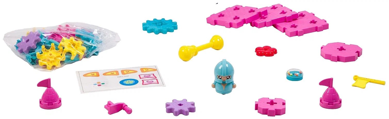 Конструктор состоит из блок-пазлов и шестеренок, которые соединяются друг с другом. Вместе детали образуют рабочие механизмы разных сложностей.