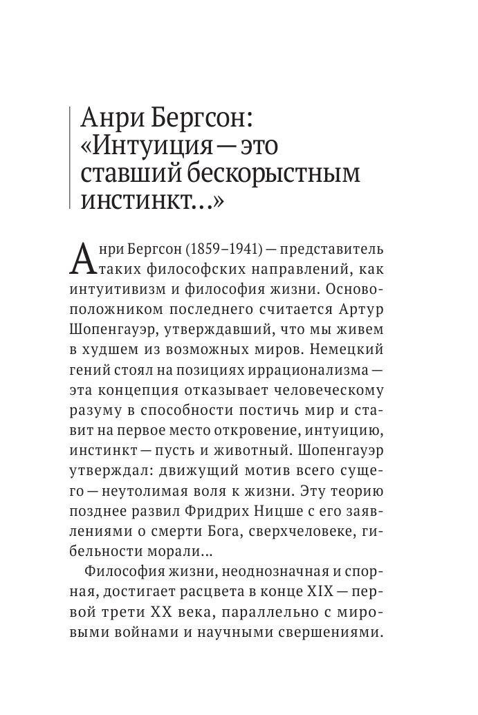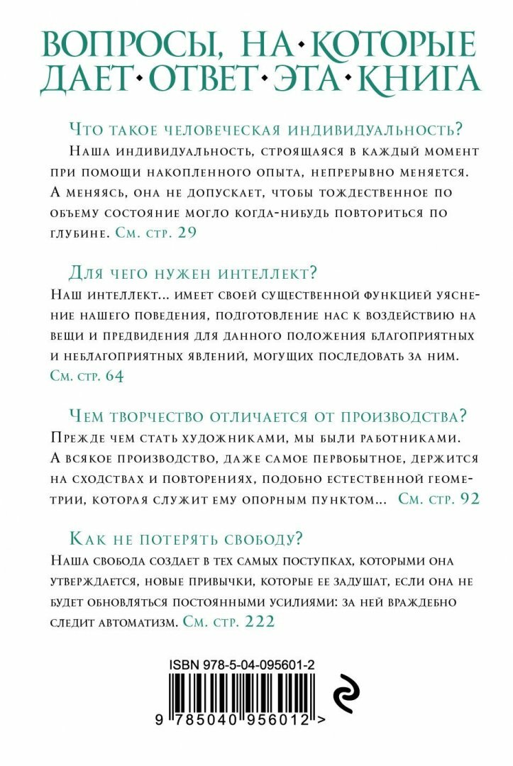 Что такое творческая интуиция? Наверное, каждый в той или иной степени испытывал на себе. Но вот определить ее, понять, как она работает, возможно, даже научиться в какой-то мере управлять ею - задача непростая. Анри Бергсон жил в эпоху серьезнейших социальных катаклизмов, и потому в нем пробудилось скептическое отношение к человеческому разуму. Постичь жизнь с помощью интеллекта невозможно, полагал он. Между тем, коснувшись столь тонкой материи, как творческая интуиция, он нашел немало закономерностей, которые будут интересны и для современного читателя, ведь каждый из нас - творец, да и миру вокруг нас свойственна творческая эволюция, которая тоже не случайна.